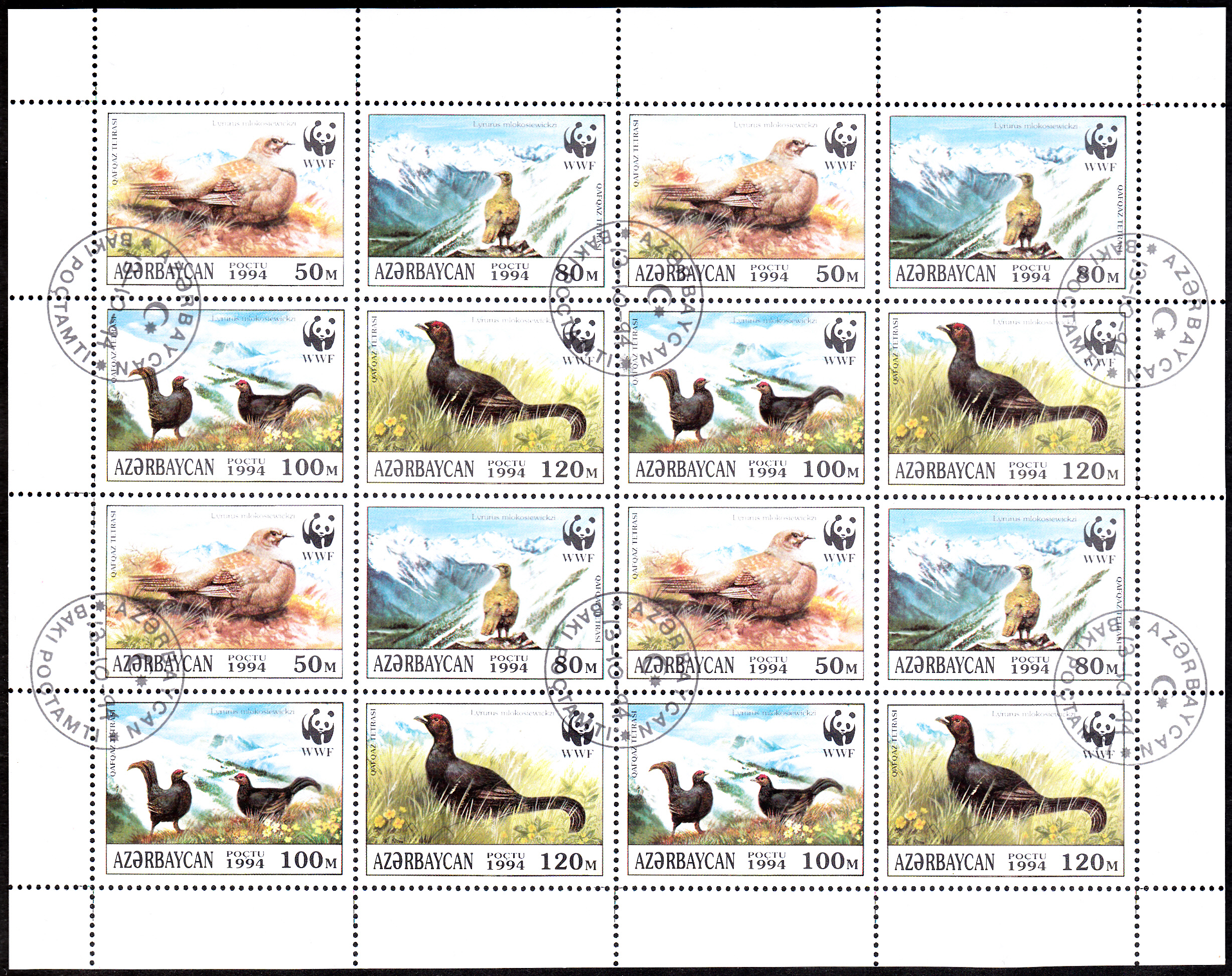 Die vier Marken mit Abbildungen zum Kaukasus-Birkhuhn (Lyrurus mlokosiewiczi) wurden zusammenhängend als Viererblock gedruckt. Im Bogen sind vier Zusammendrucke enthalten. Hier zeige ich einen kompletten Bogen.