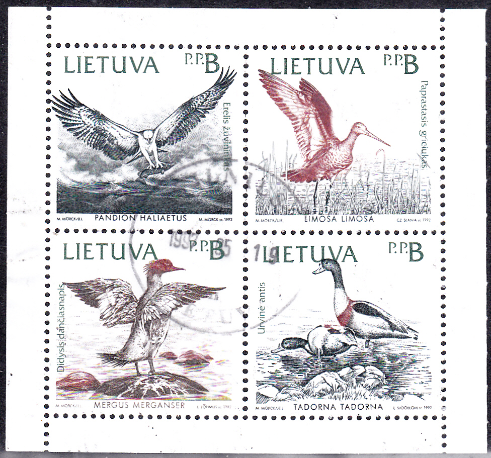 Eine Marke aus Litauen (MiNr 503) zeigt einen Gänsesäger (Mergus merganser).