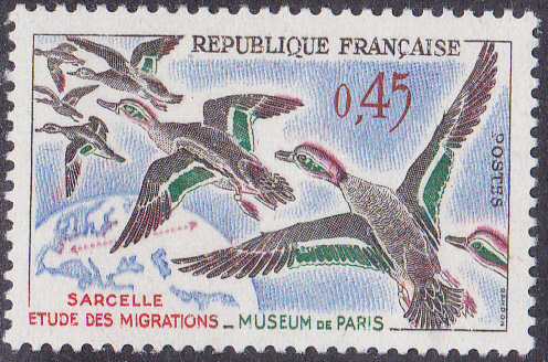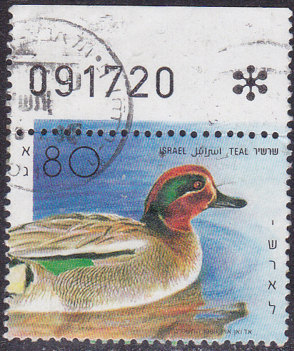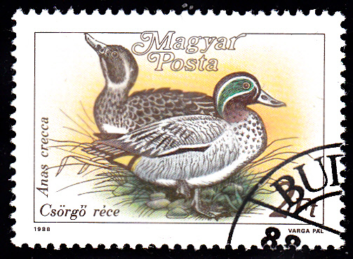 Auf dieser Marke aus Ungarn aus einer Serie "Wildenten" (MiNr 3972 A) ist ein Krickentenpaar (Anas crecca) zu sehen.