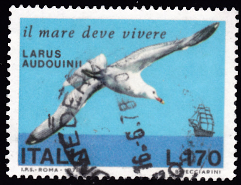 Es folgt eine Marke aus Italien (MiNr 1606) mit einer fliegenden Korallenmöwe (Larus audouinii).