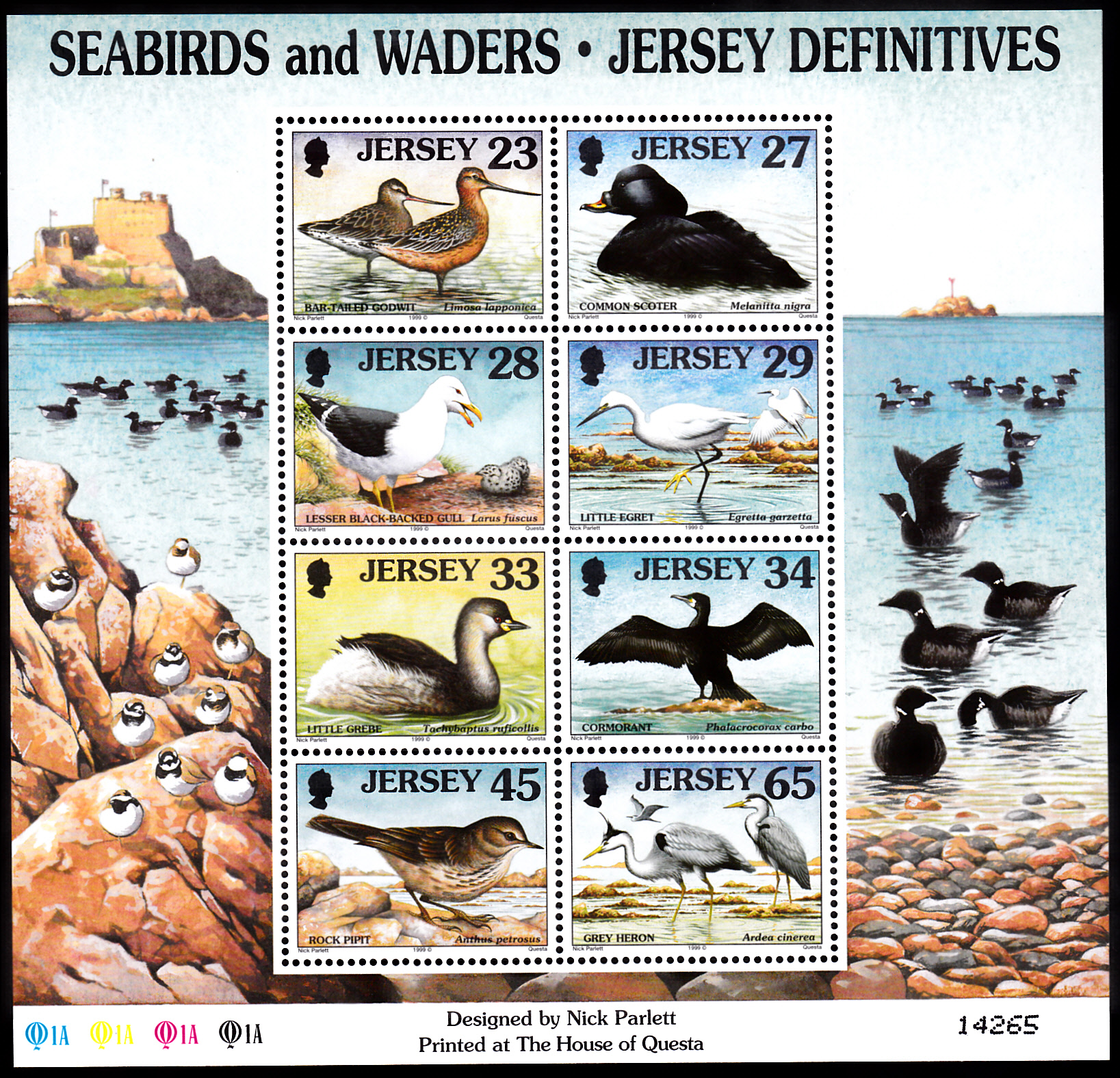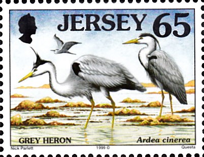 Diese Marke aus Großbritannien-Jersey (MiNr 903) zeigt zwei stehende und einen fliegenden Graureiher (Ardea cinerea).