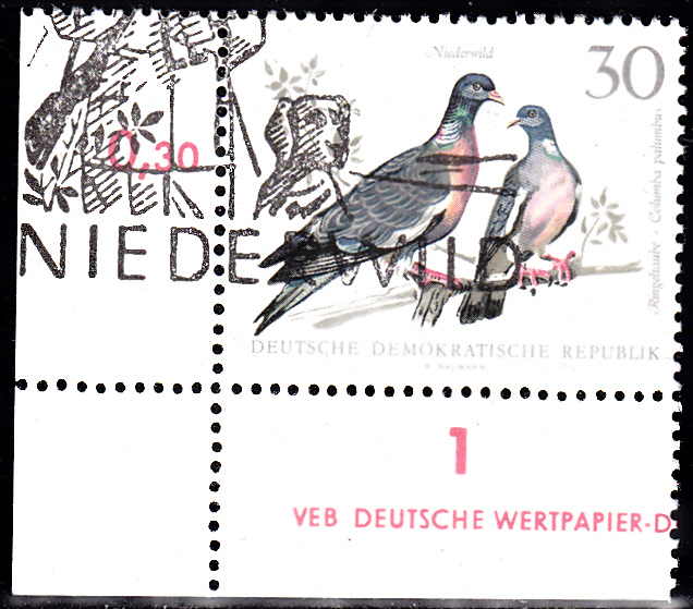 In der DDR ist 1968 eine Markenserie zum Thema "Niederwild" erschienen. Eine der Marken zeigt ein Ringeltauben-Pärchen (Columba palumbus). Hier eine Marke vom unteren linken Bogenrand mit einem Teil des Druckvermerkes.
