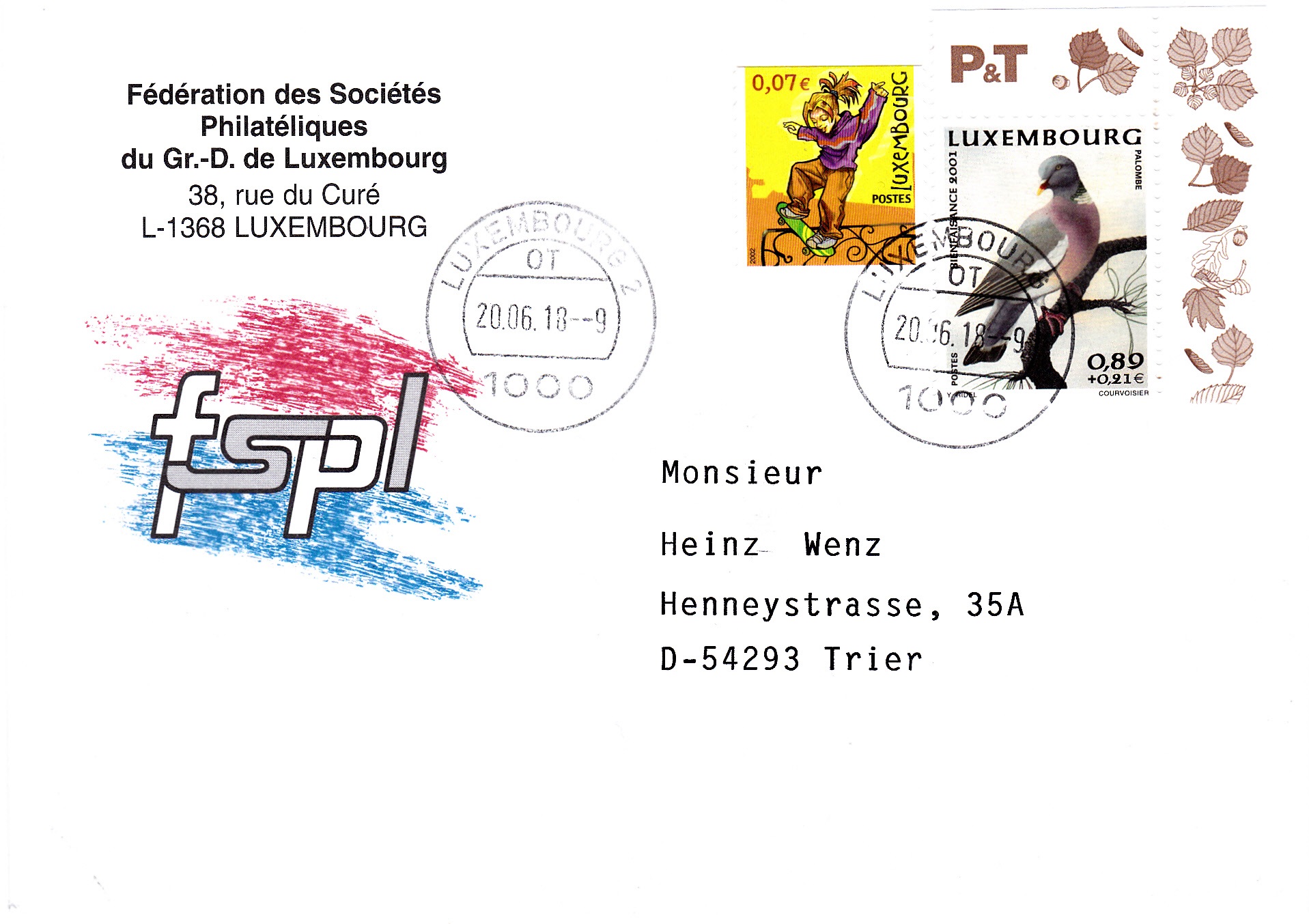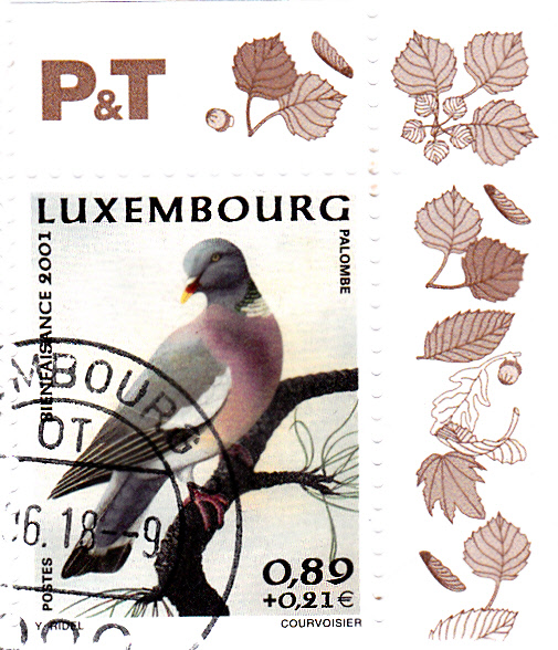 Es gibt auch eine Marke aus Luxemburg (MiNr 1557) mit dem Motiv "Ringeltaube (Columba palumbus)". Hier wurde eine Marke zur Frankatur eines Briefes von Luxemburg nach Trier verwendet: