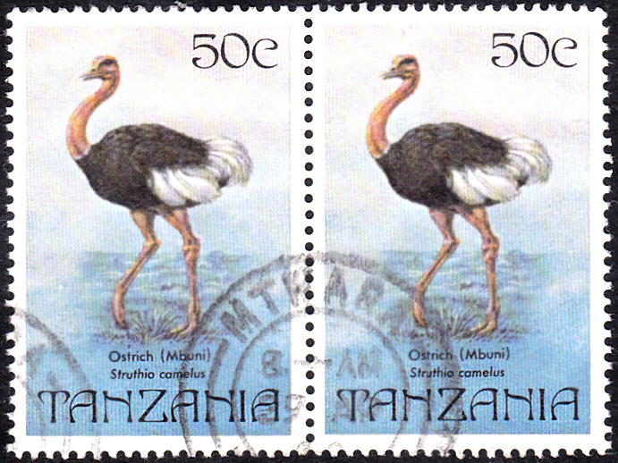 Auf einer Marke aus Tansania (MiNr 193) wird ebenfalls ein Strauß (Struthio camelus) gezeigt. Hier ein waagerechtes Paar dieser Marke: