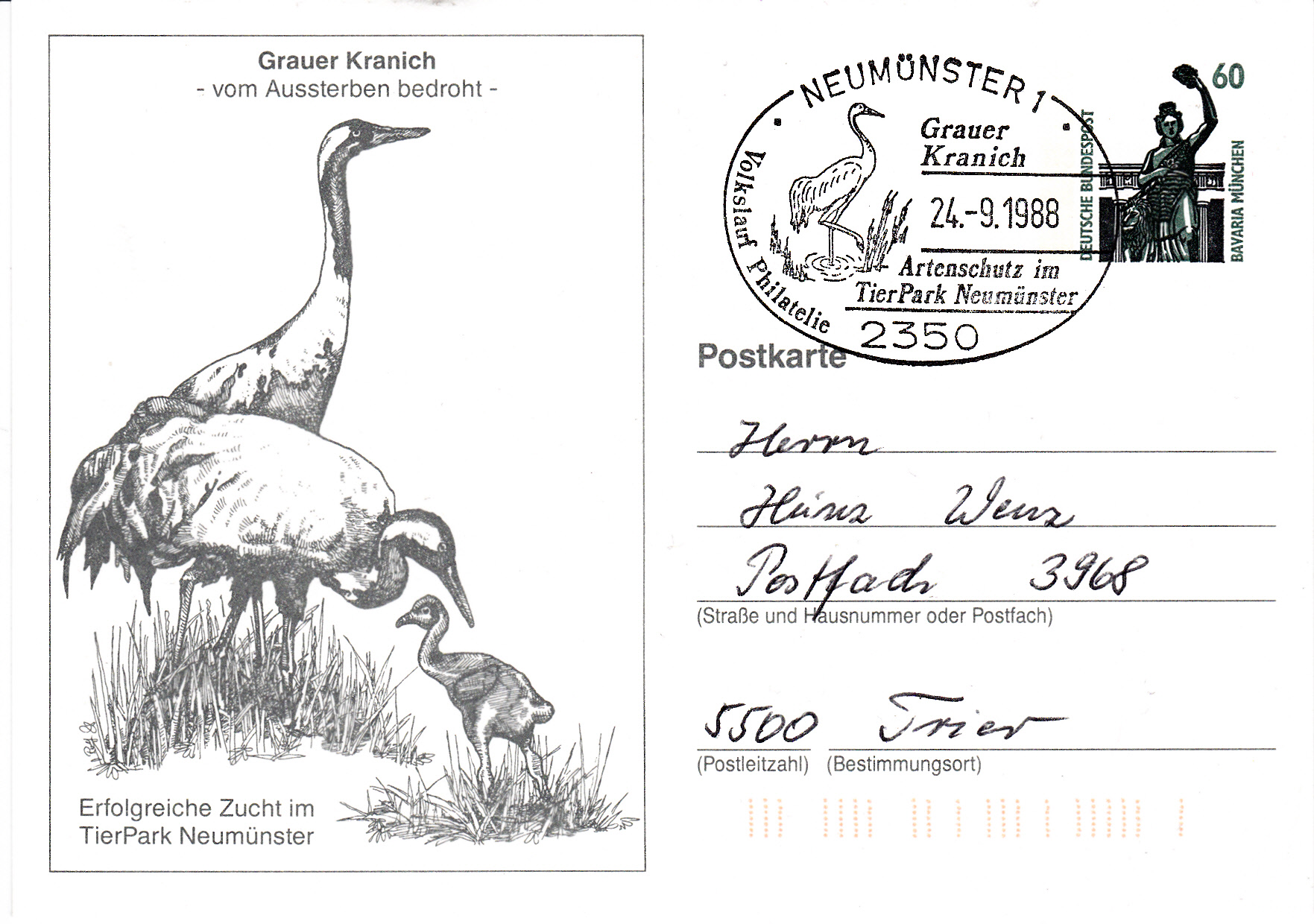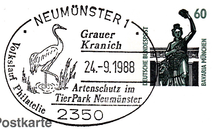 Dieser Sonderstempel vom 24.9.1988 aus Neumünster mit einem Grauen Kranich im Stempelbild wurde auf einer Privatganzsachenpostkarte abgeschlagen. Auf der Ganzsache wird ein Kranichpaar mit Nachwuchs gezeigt.