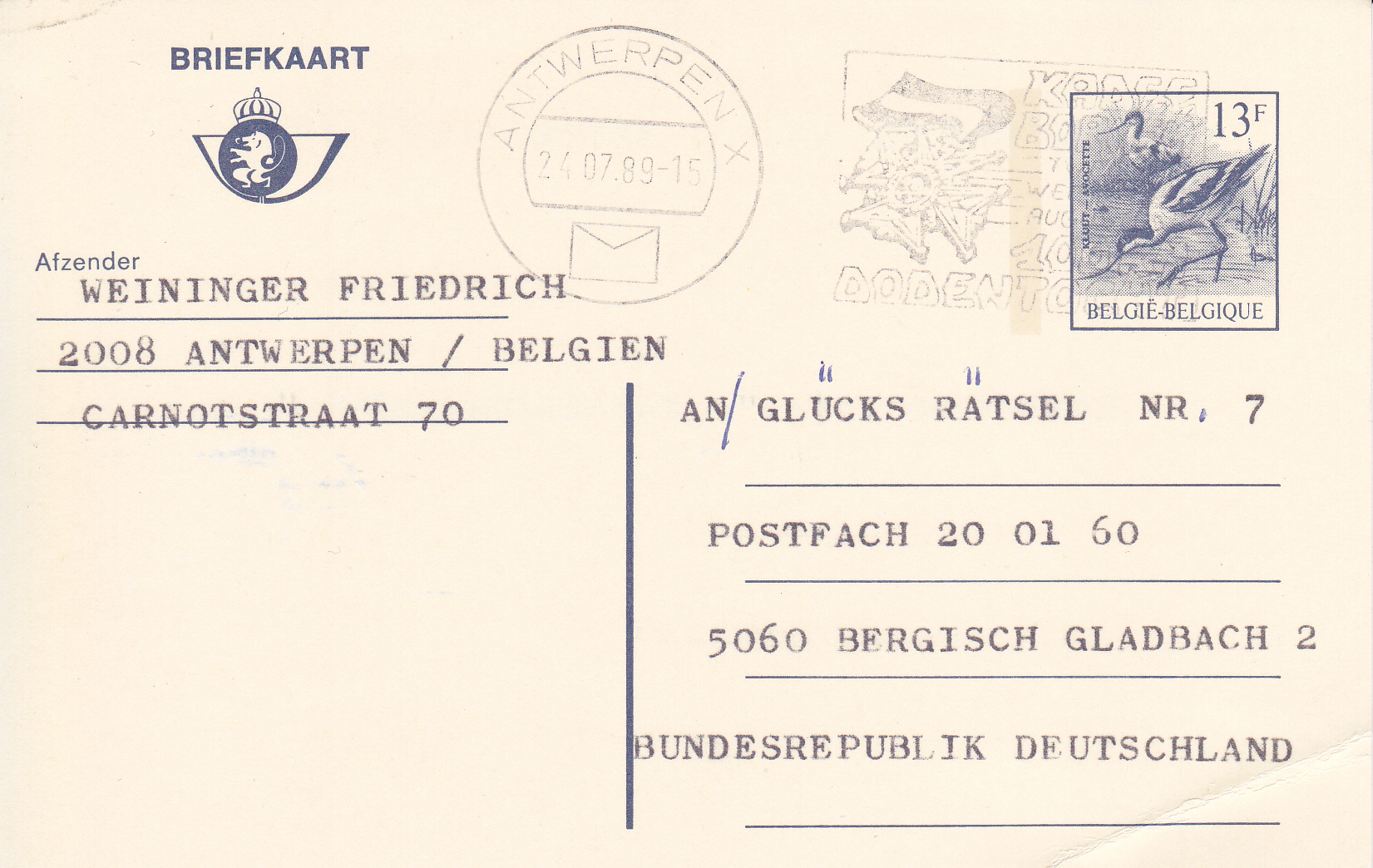 Ganzsachen-Postkarte aus Belgien mit einem Wertstempel zu 13 Franken mit dem Motiv "Säbelschnäbler".