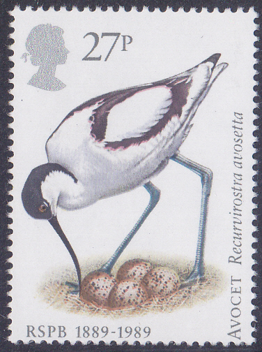 Eine Marke aus Großbritannien (MiNr 1185) zeigt einen Säbelschnäbler (Recurvirostra avosetta) mit seinem Gelege.