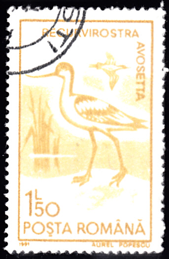 Aus Rumänien kommt diese Marke (MiNr 4644) mit einem Säbelschnäbler (Recurvirostra avosetta) am Boden und einem im Flug.