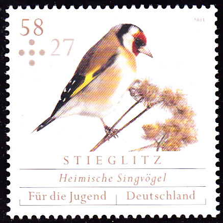 Auf einer Marke der Serie "Für die Jugend" 2013 (MiNr 3023) mit Heimischen Singvögel ist ein Stieglitz (Carduelis carduelis) abgebildet.