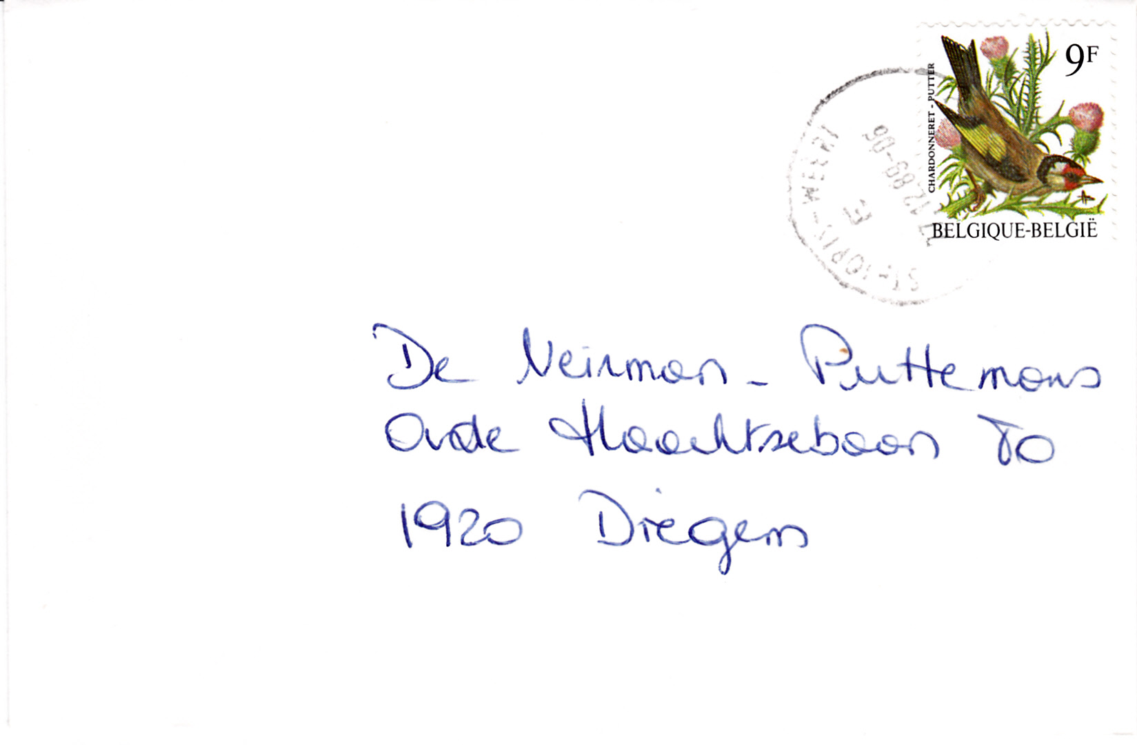 Die bereits gezeigte Marke aus Belgien (MiNr 2242) mit einem Stieglitz wurde hier auf diesem Umschlag als Frankatur verwendet.