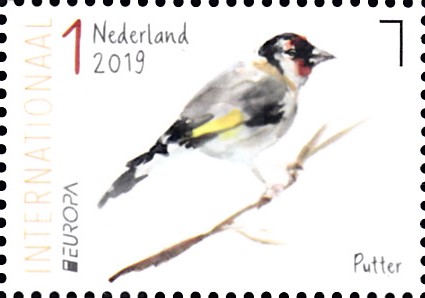 Auf einer Europamarke 2019 (MiNr 3814) aus den Niederlande wird ein Stieglitz (Carduelis carduelis) gezeigt.