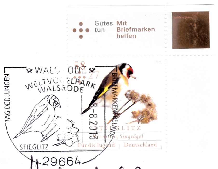 Am Ersttag der hier bereits gezeigten Marke der Serie "Für die Jugend" 2013 (MiNr 3023) mit einem Stieglitz (Carduelis carduelis) wurde im Vogelpark Walsrode auch ein Sonderstempel zum Tag der Jungen Briefmarkenfreunde mit einem Stieglitz im Stempelbild eingesetzt.