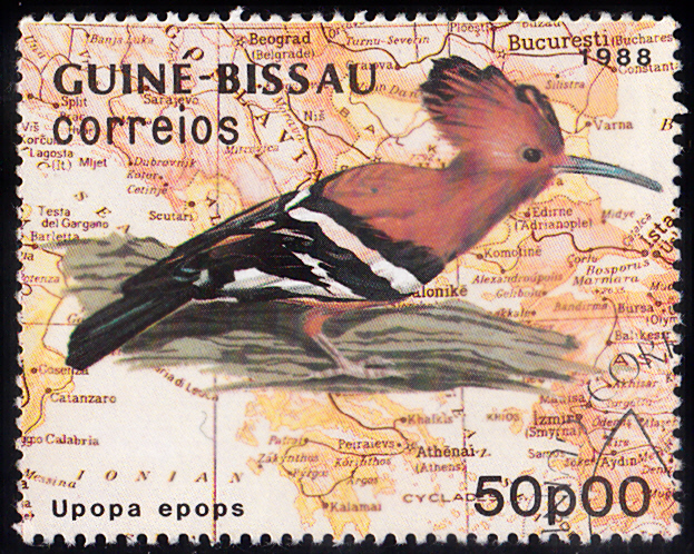 Einen weiteren Wiedehopf (Upupa epops) sehen wir auf dieser Marke (MiNr 984) aus Guinea-Bissau.