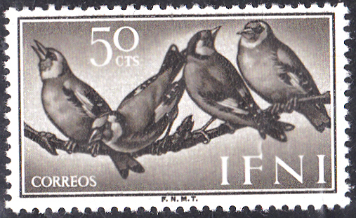 us Ifni (ehemalige spanische Kolonie an der westafrikanischen Atlantikküste auf Höhe der Kanarischen Inseln, südlich von Agadir in Marokko) kommt diese Marke (MiNr 193) mit Stieglitze (Carduelis carduelis).