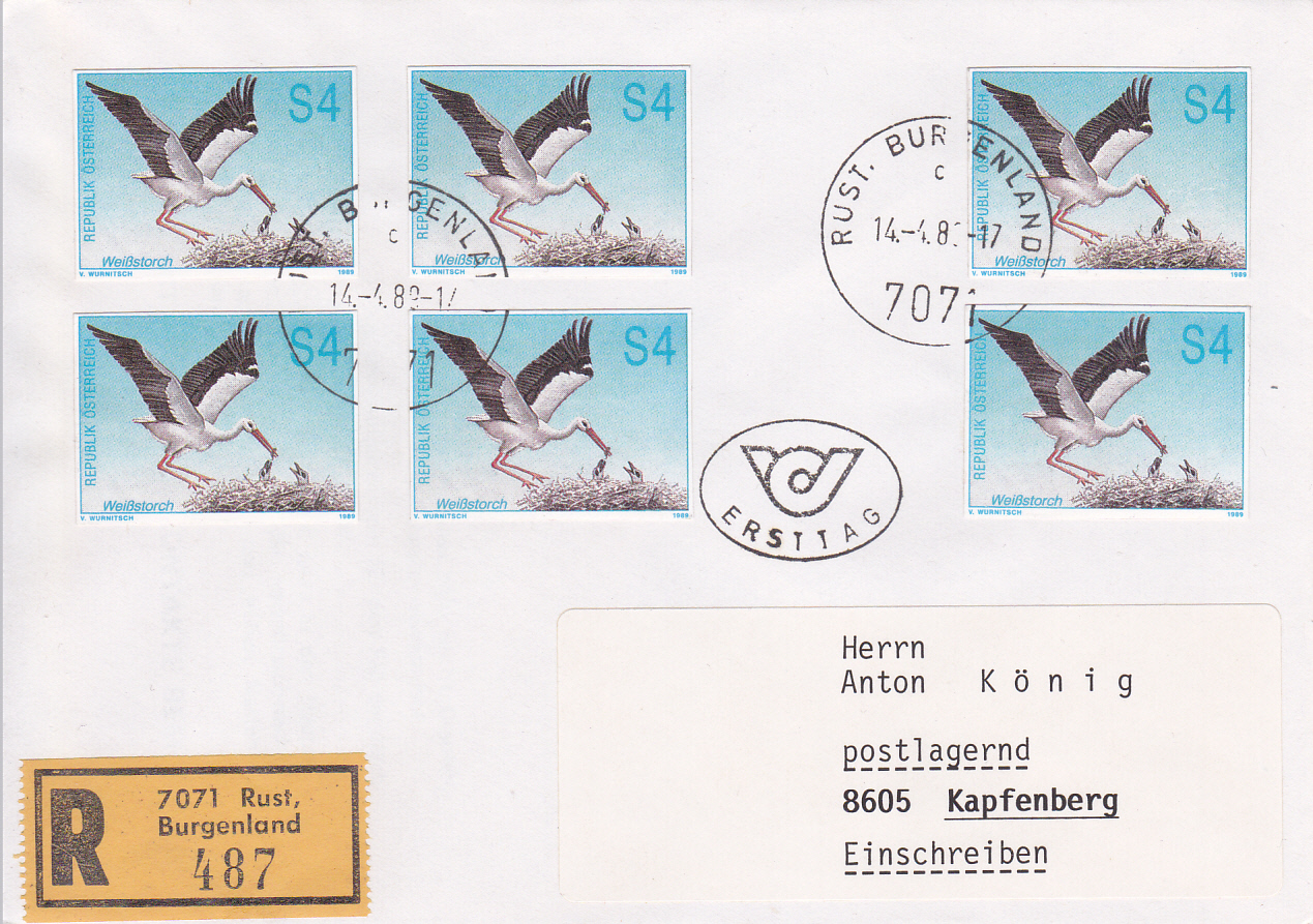 Einschreibebrief von Rust nach Kapfenberg frankiert mit Ganzsachenausschnitten aus einer Inlandspostkarte (MiNr P 497) mit dem Wertstempelmotiv "Weißstorch beim Füttern seiner Jungen".