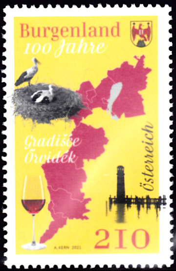Auf dieser Marke aus Österreich (MiNr 3611) aus Anlass "100 Jahre Zugehörigkeit des Burgenlandes zu Österreich" sehen wir oben links auch ein für das Burgenland typisches Storchennest.