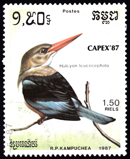 Aus Kambodscha kommt diese Marke (MiNr 871) mit einem Graukopfliest (Halcyon leucocephala), den ich hier schon früher beschrieben habe.