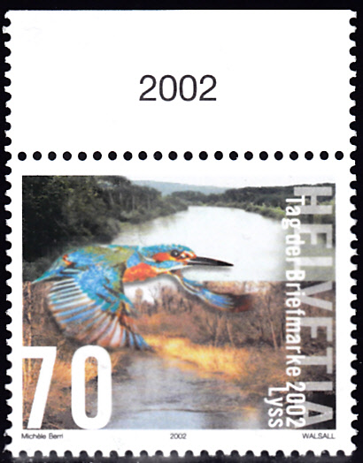 Eine Marke aus der Schweiz (MiNr 1817) zum Tag der Briefmarke 2002 zeigt einen Eisvogel (Alcedo atthis) in einer Auenlandschaft.
