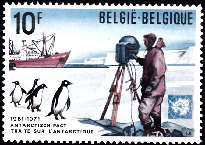 Auf dieser Marke zum Thema "10 Jahre Antarktis-Vertrag" sind neben einem Landvermesser und dem Forschungsschiff "Erika Dan" auch Adeliepinguin (Pygoscelis adeliae) zu sehen.