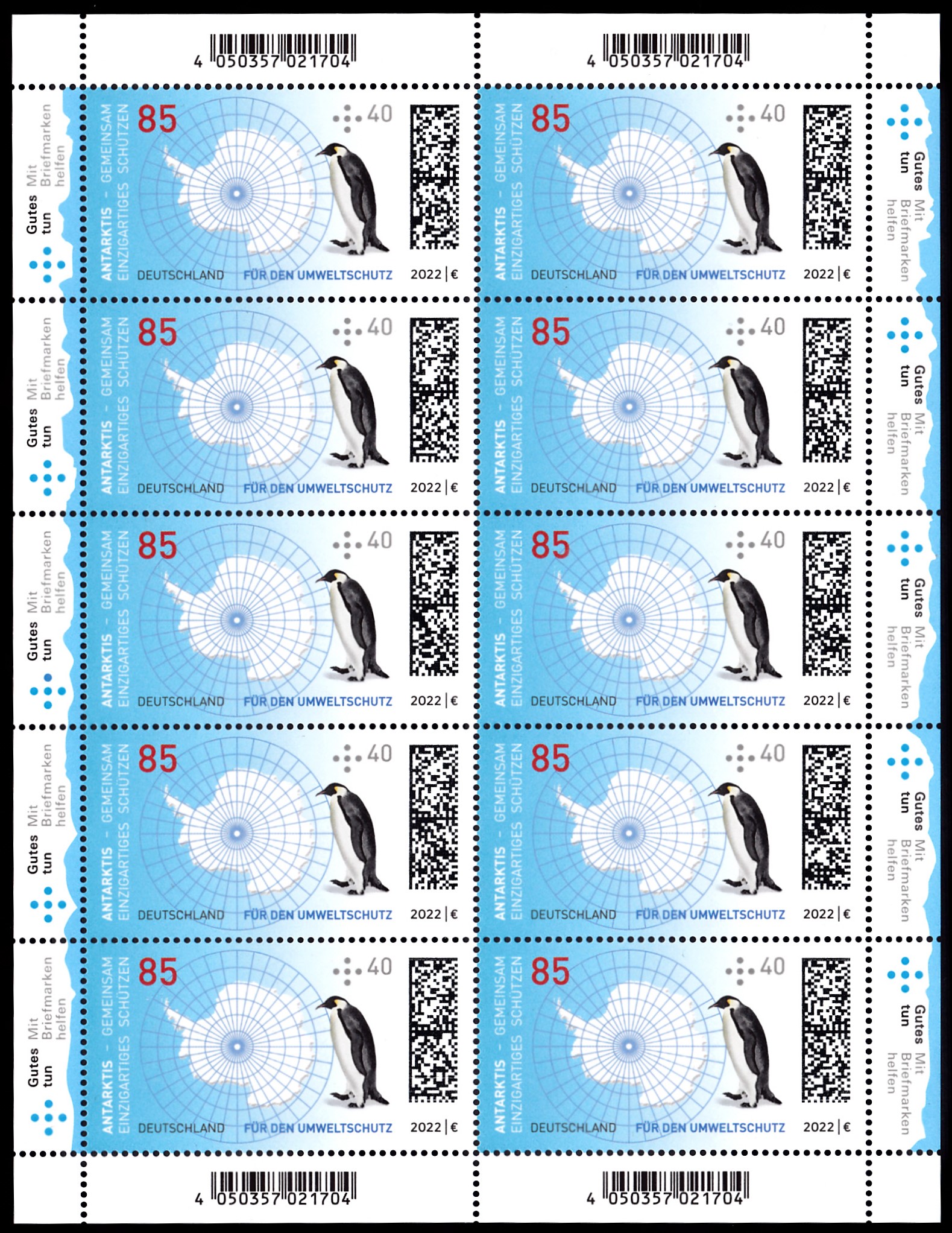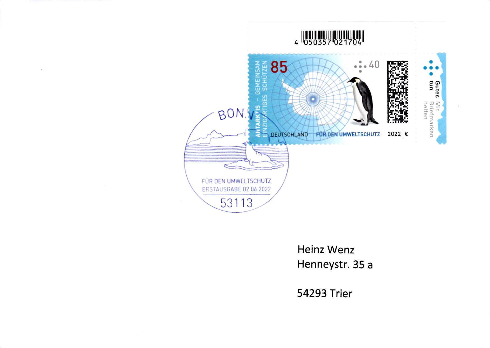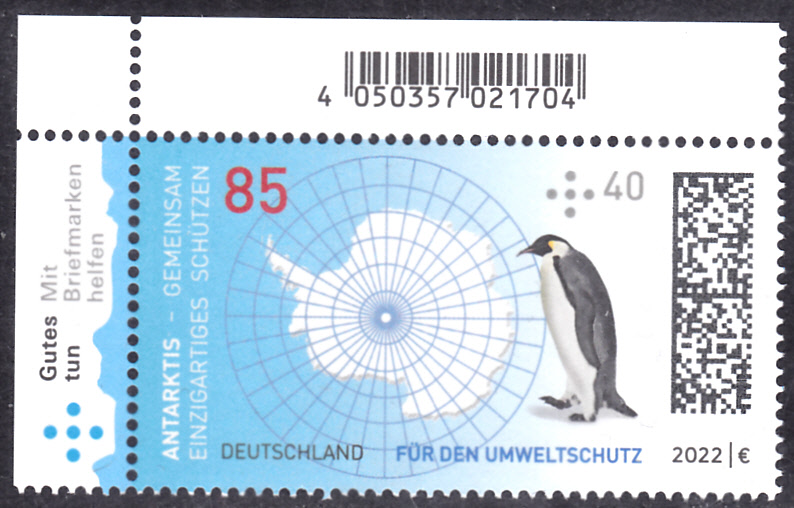 Die Marke "Umweltschutz" 2022 der Deutschen Post steht (MiNr 3689) unter dem Motto "Schutz der Arktis" und bildet eine Karte der Antarktis und einen Kaiserpinguin (Aptenodytes forsteri) ab. Ich zeige hier ein Eckrandstück mit EAN-Codierung.
