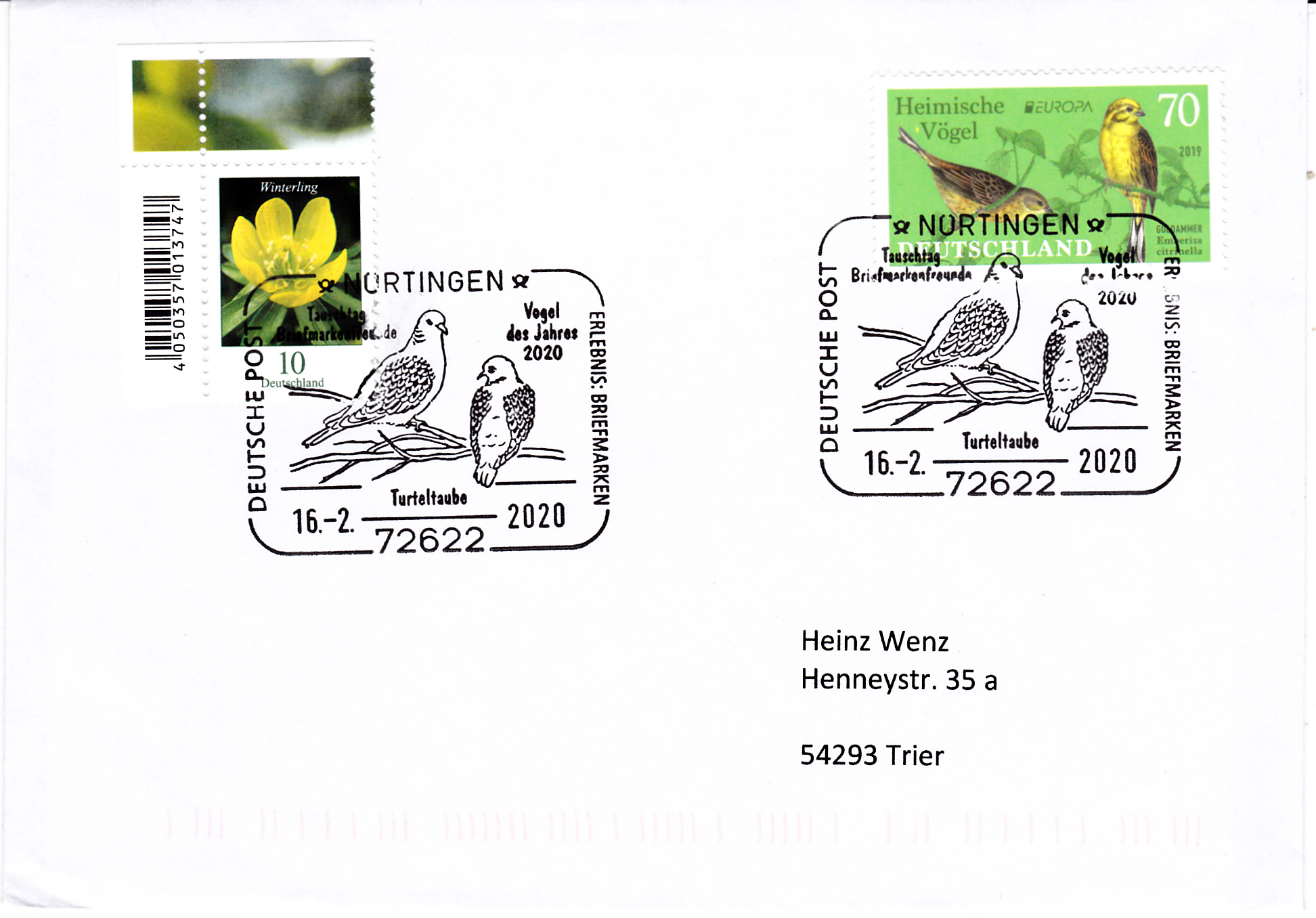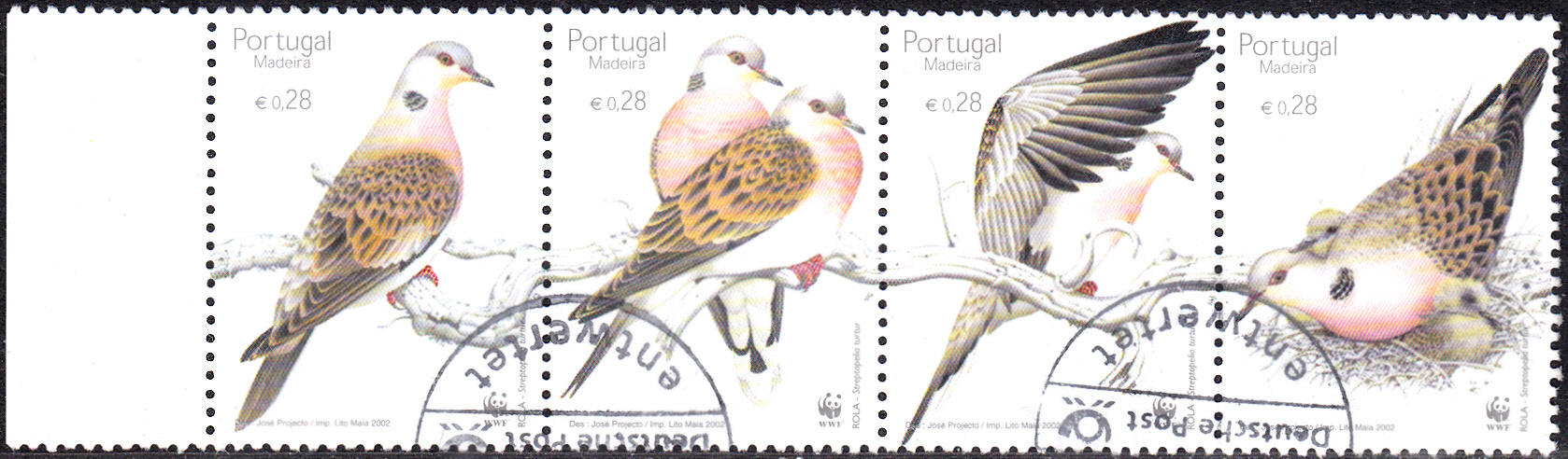 Die vier Marken waren auf einem Brief nach Deutschland verklebt, in Portugal nicht gestempelt und bei der Deutschen Post wurden sie "nachträglich entwertet".