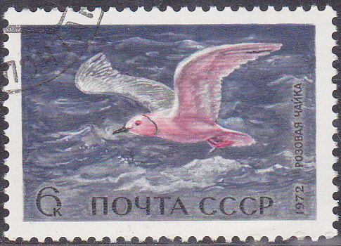 Hier eine Marke aus der Sowjetunion (MiNr 3975) mit einer Rosenmöwe (Rhodostethia rosea) im Flug.