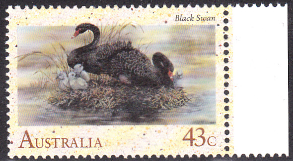 Die Marke aus Australien (MiNr 1237) zeigt ein Trauerschwanpaar (Cygnus atratus) mit drei Jungen i n ihrem Nest.