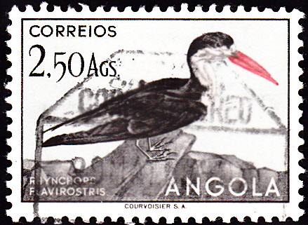 Auf dieser Marke aus Angola wird ein Braunmantel-Scherenschnabel (Rynchops flavirostris) gezeigt. Im Michel wird er als Gelbschnäbliger Scherenschnabel (Rhynchops flavirostris) bezeichnet.