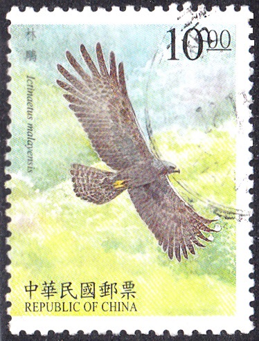 Auf dieser Marke aus China Taiwan (MiNr 2486) wird ein Malaienadler (Ictinaetus malaiensis) im Flug gezeigt.