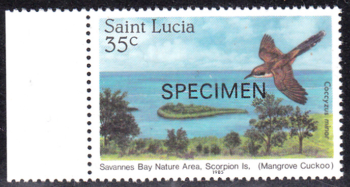 In einer Serie "Naturschutz" aus St. Lucia ist eine Marke (MiNr 772) mit Mangrovenkuckuck (Coccyzus minor) im Flug erschienen. Im Michel wird er Kleiner Regenkuckuck (Coccyzus minor) genannt. Hier zeige ich eine Mustermarke.