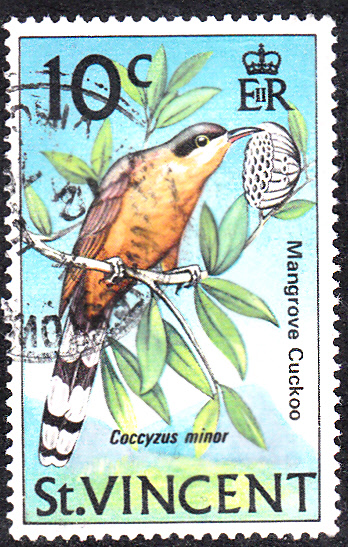 Auf dieser Marke aus einer Freimarkenserie "Einheimische Vögel" aus St. Vincent (MiNr 266) ist ebenfalls ein ein Mangrovenkuckuck (Coccyzus minor) abgebildet.