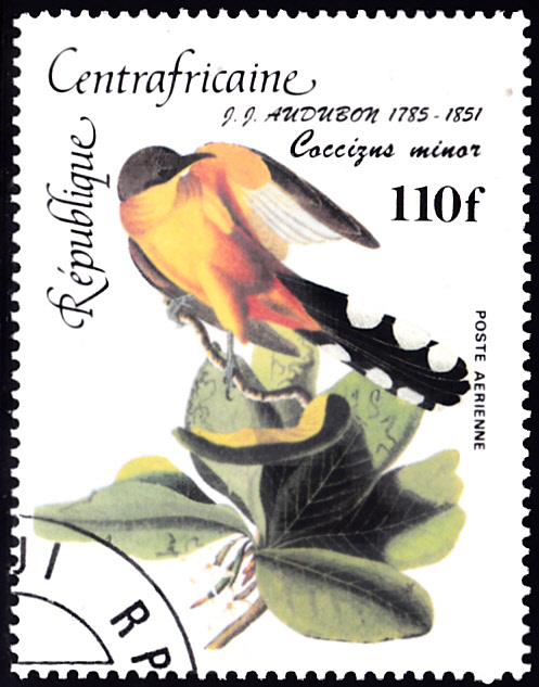 Diese Marke aus der Zentralafrikanische Republik (MiNr 1095) zeigt eine Zeichnung von John James Audubon mit einem Mangrovenkuckuck (Coccyzus minor). Michel nennt als Name Kleiner Regenkuckuck (Coccyzus minor).