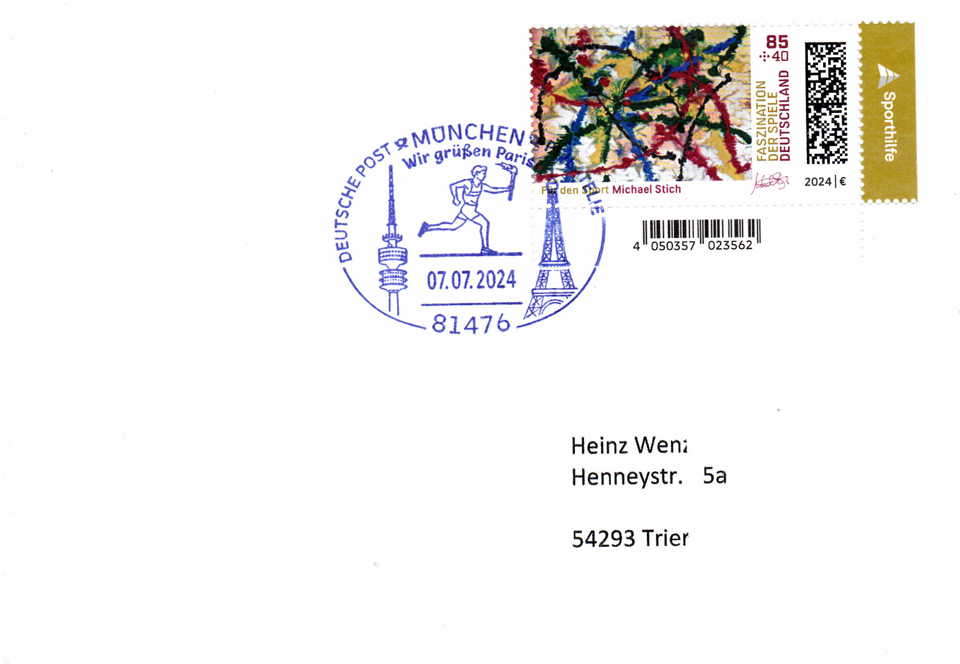 Brief mit der Marke zu 85+40 Cent der Deutschen Post (MiNr 2825) und einem Sonderstempel vim 7.7.2024 aus München mit dem Olympiaturm München, einem Fackelträger und dem Eiffelturm Paris sowie der Inschrift "Wir grüßen München".