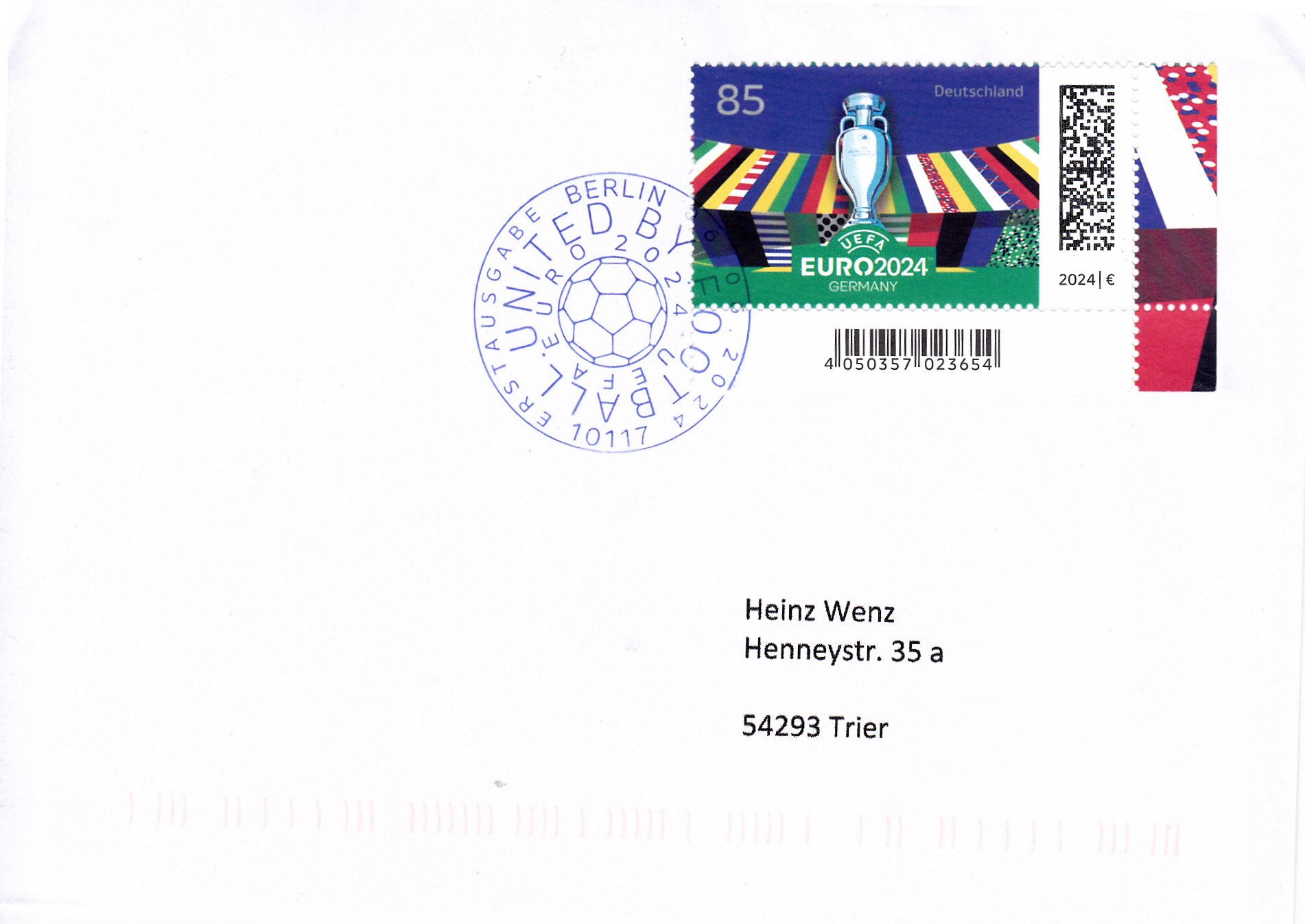 Bei der Deutschen Post ist eine Marke (MiNr 3835) mit dem Henri-Delaunay-Pokal vor einer Stadionkulisse zur EM 2024 erschienen. Hier zeige ich eine Marke vom Eckrand mit EAN-Codierung.