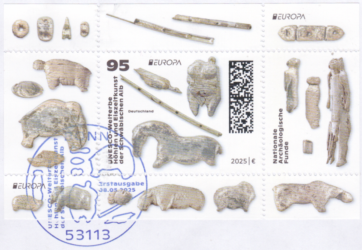 Die Europamarke 2025 ist in einer Blockausgabe bei der Deutschen Post am 8. Mai 2025 zum Thema "Nationale archäologische Funde" erschienen. Die Marke zu 95 Cent (MiNr 3907) zeigt "Wasservogel, Venusfigurine, Flöte, Wildpferd" nach Mammutelfenbein- und Knochenfiguren aus den Höhlen Vogelherd, Hohler Fels, Geißenklösterle und Hohlensteinstadel (UNESCO-Welterbe "Höhlen und Eiszeitkunst der Schwäbischen Alb").