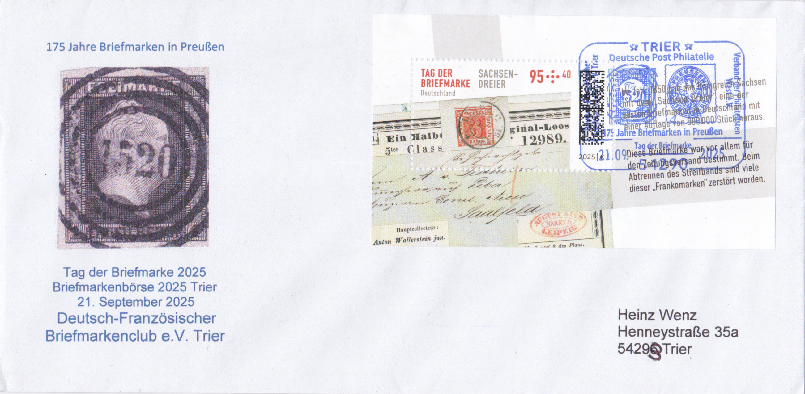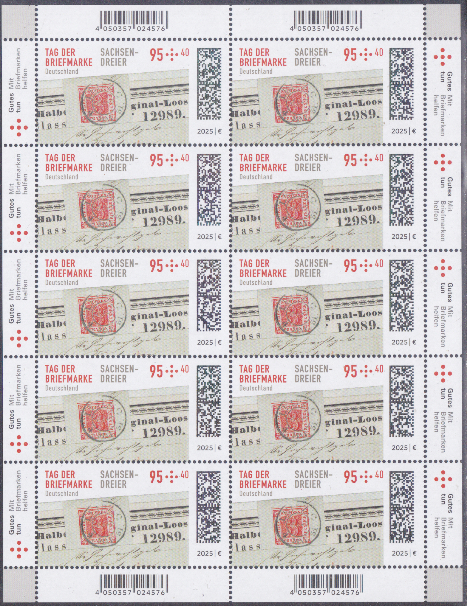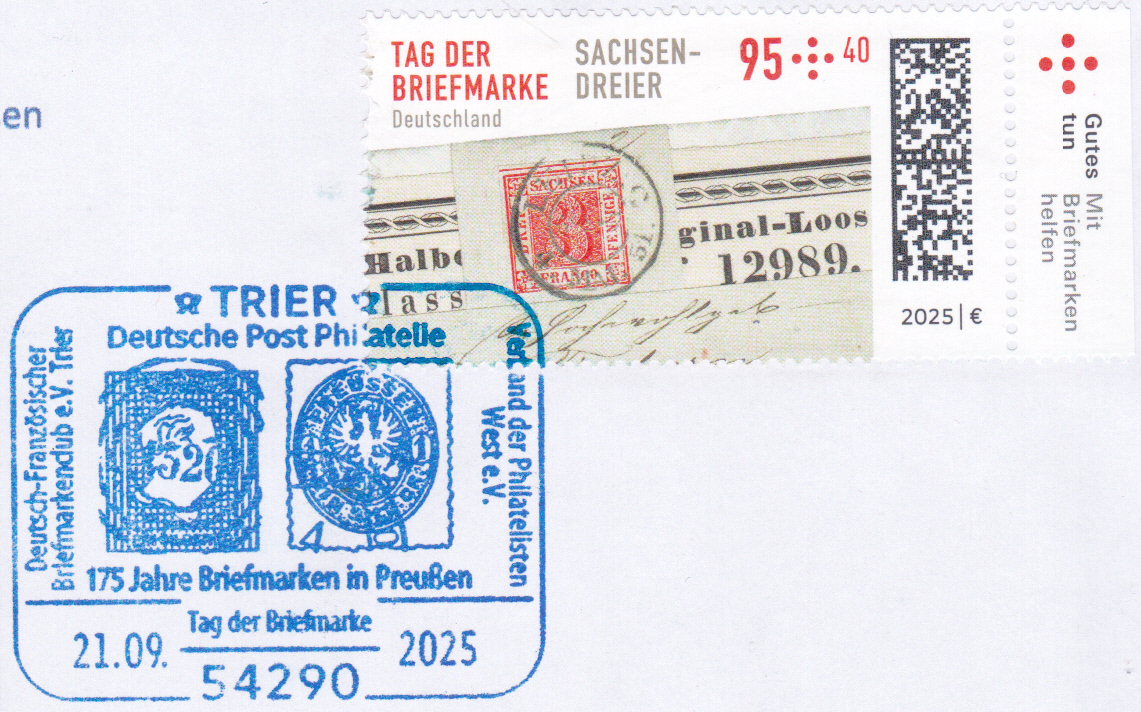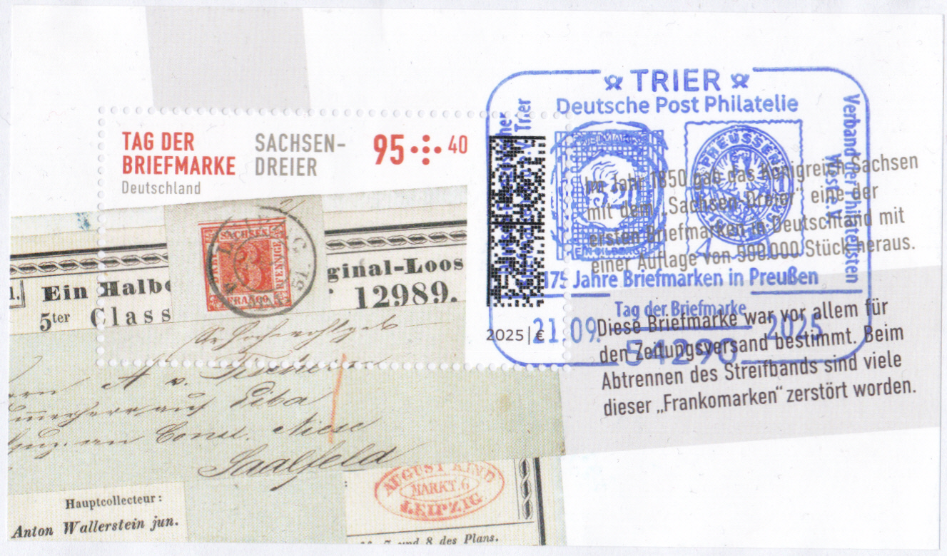 Am 4. September 2025 erschien bei der Deutschen Post eine Marke (MiNr 3923) zum Tag der Briefmarke 2025. Sie zeigt die Freimarke Sachsen MiNr. 1 vom 1. Juli 1850 auf Streifband, gestempelt am 4. Mai 1851 in Leipzig. Hier zeige ich eine Marke vom Eckrand mit EAN-Codierung.