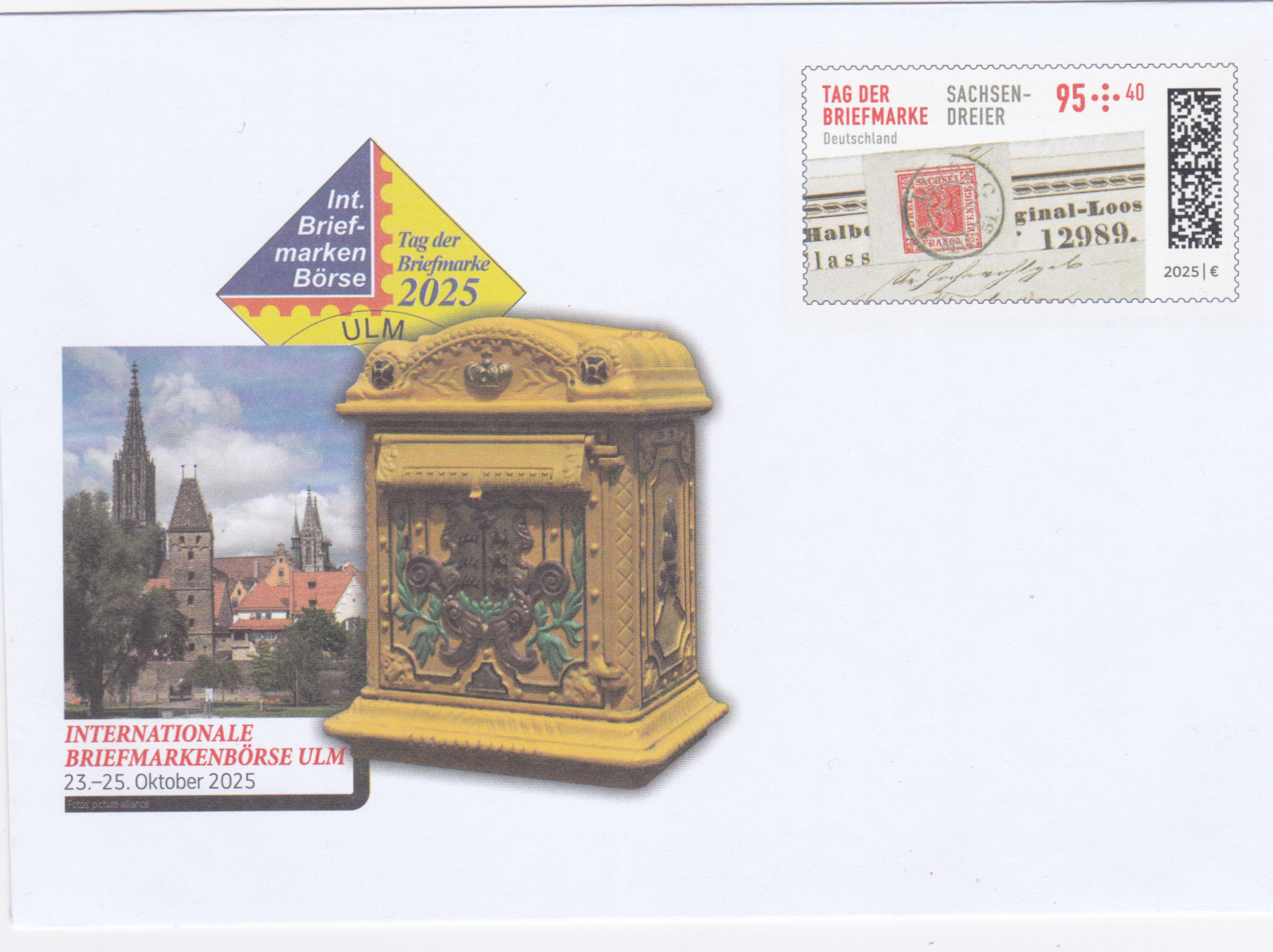 Zur Briefmarkenmesse Ulm ist ein Ganzsachenumschlag mit dem Wertzeicheneindruck im Muster der Marke zum Tag der Briefmarke 2025 erschienen. Hier zeige ich ein nicht verschicktes Exemplar.