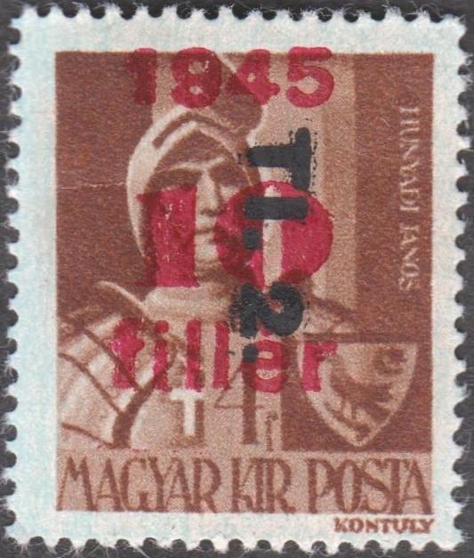 Diese Freimarke für den Inlandsverkehr, Ungarn MiNr. 857, erschien am 14.01.1946, indem die Freimarke Ungarn MiNr. 754, 20 f braunoliv, mit einem Aufdruck in Rot "Ajl. l. (= Einschreibbriefe) versehen wurde: