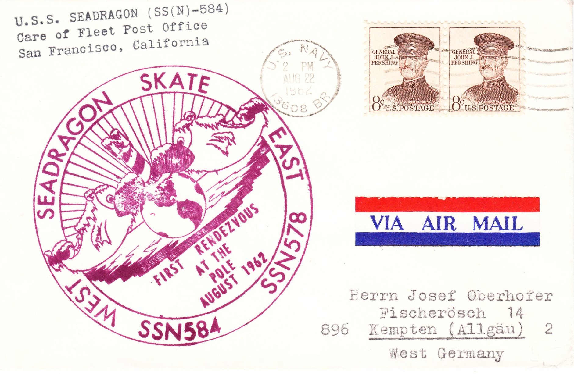 Dieser Beleg vom 22.08.1962 dokumentiert durch einen speziellen Cachetstempel das denkwürdige Zusammentreffen der beiden Unterseeboote am Nordpol: