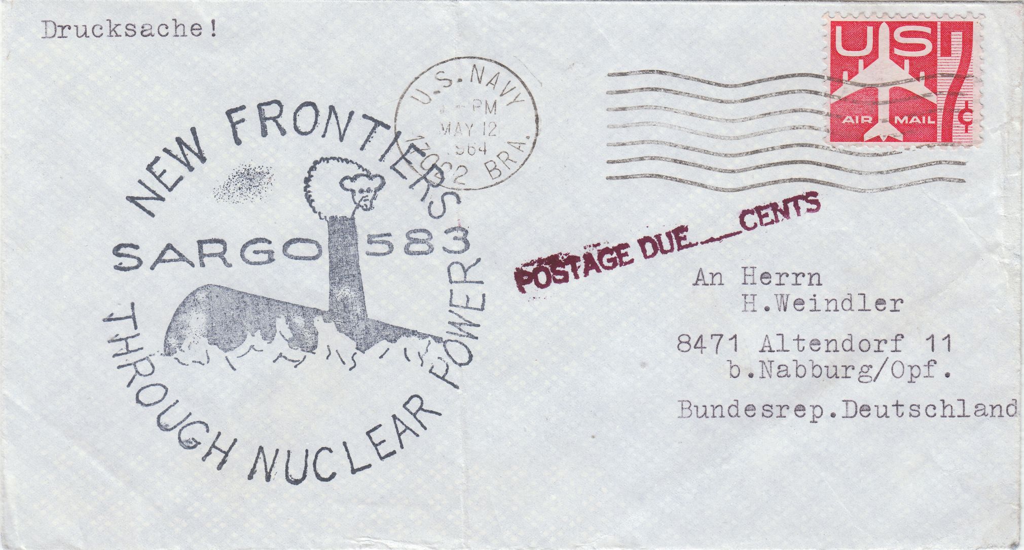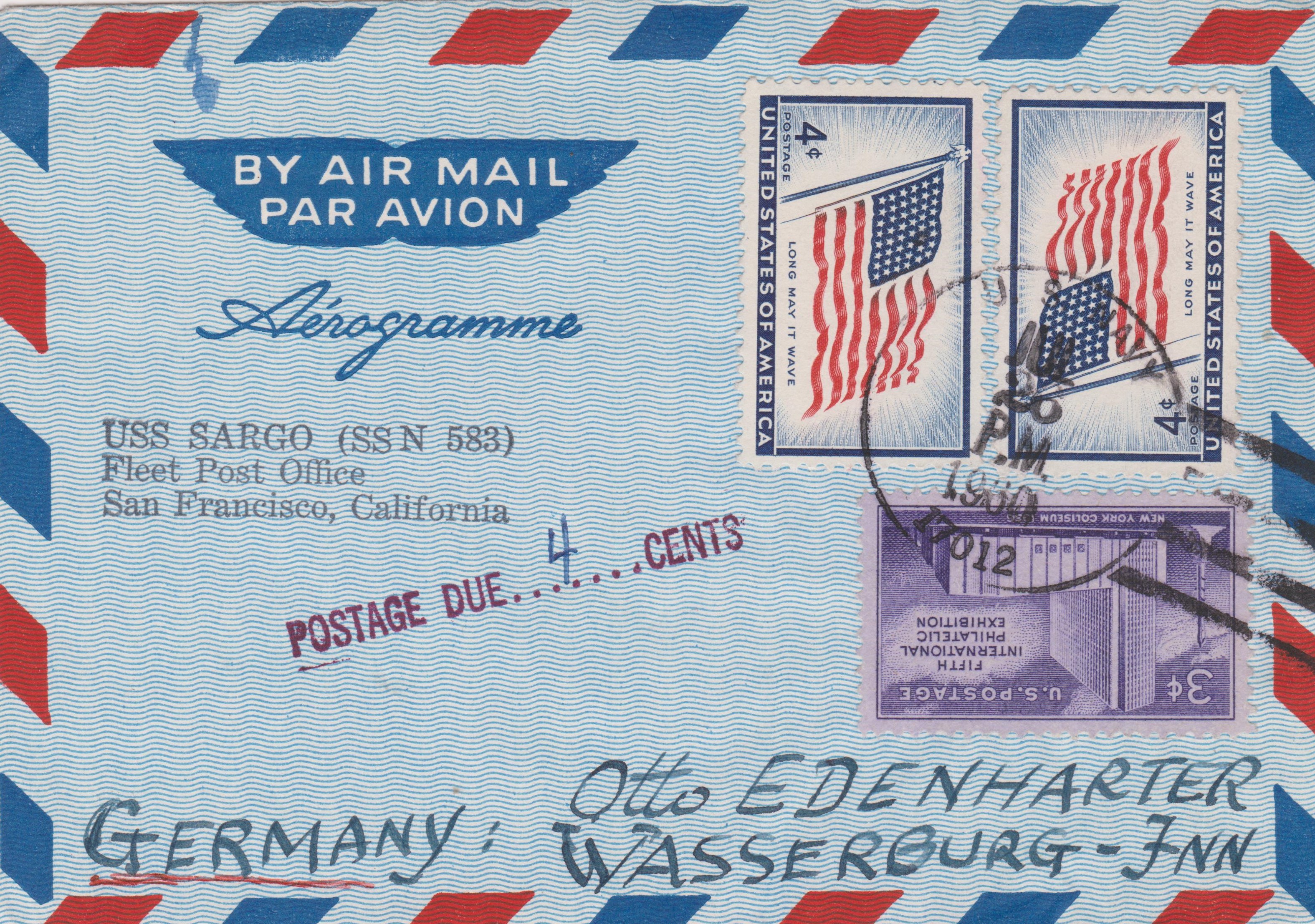 Für den Cachetstempel der USS SARGO war auf der Vorderseite dieses Beleges nicht mehr genug Platz, deshalb wurde dieser auf der Rückseite abgeschlagen: