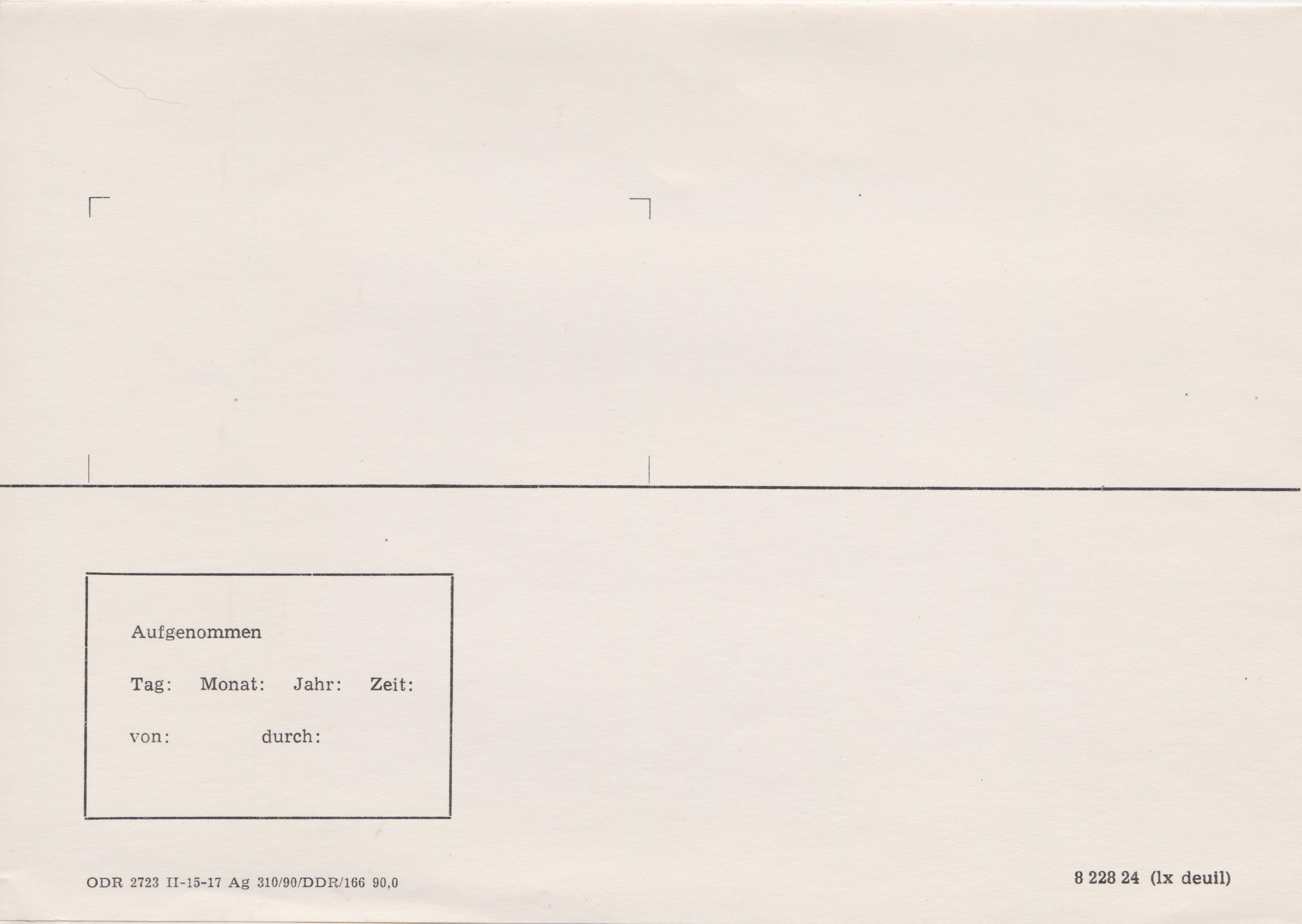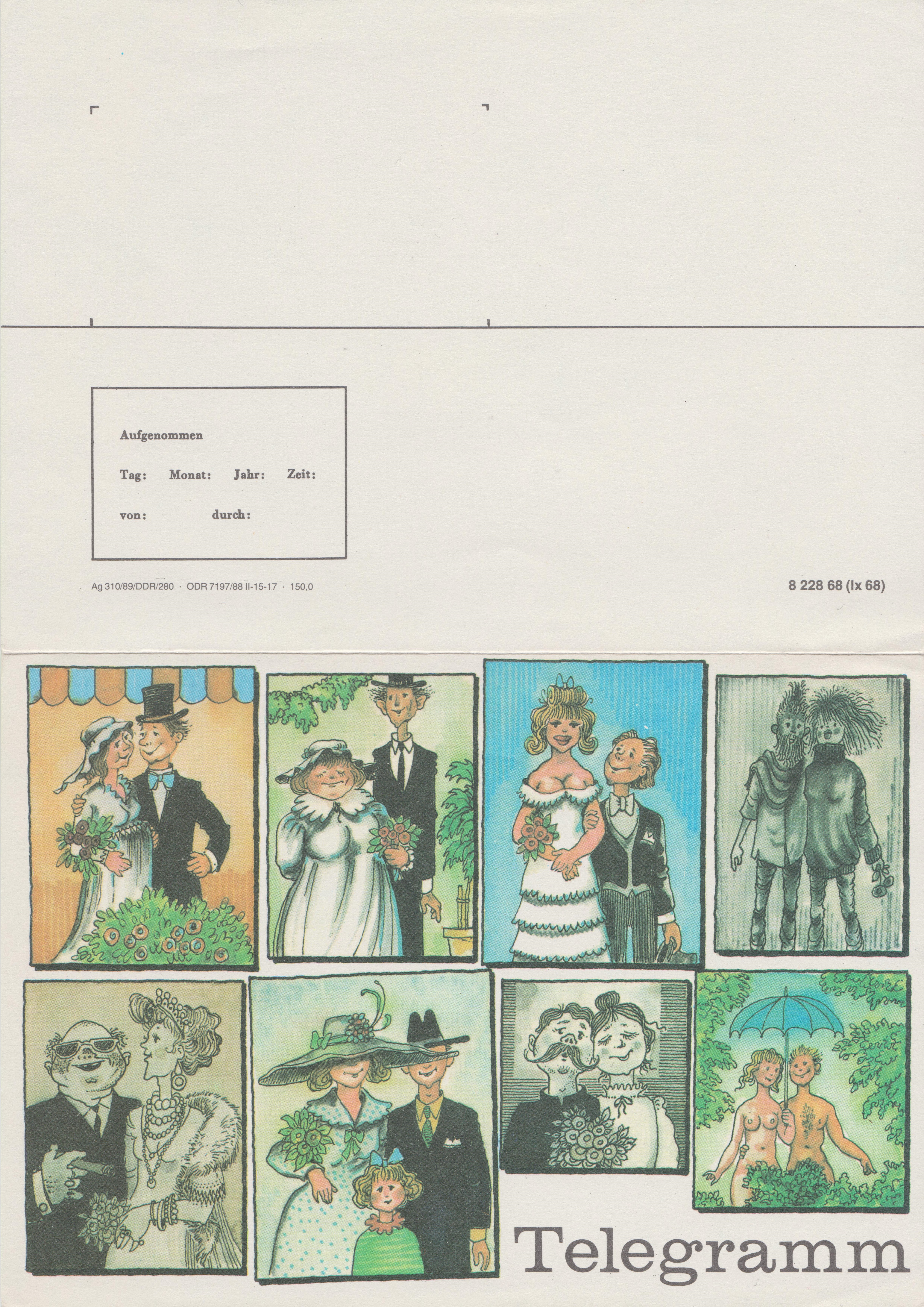 Dieses einzigartige Telegrammblatt erschien 1987 anlässlich des Berlin-Jubiläums mit einer eingedruckten Wertmarke zu 2 Mark. Nach dem Erwerb eines Telegrammblattes konnte man zwischen zwei vorgegebenen Grußtexten wählen und deren Text-Nr. eintragen. Der Grußtext wurde dann von der Post in einem besonderen Schmuckblatt dem Empfänger zugestellt. Das aufgegebene Telegrammblatt verblieb als Nachweis bei der Post. Daher kommen diese Telegrammblätter nur in ungebrauchter Erhaltung vor.