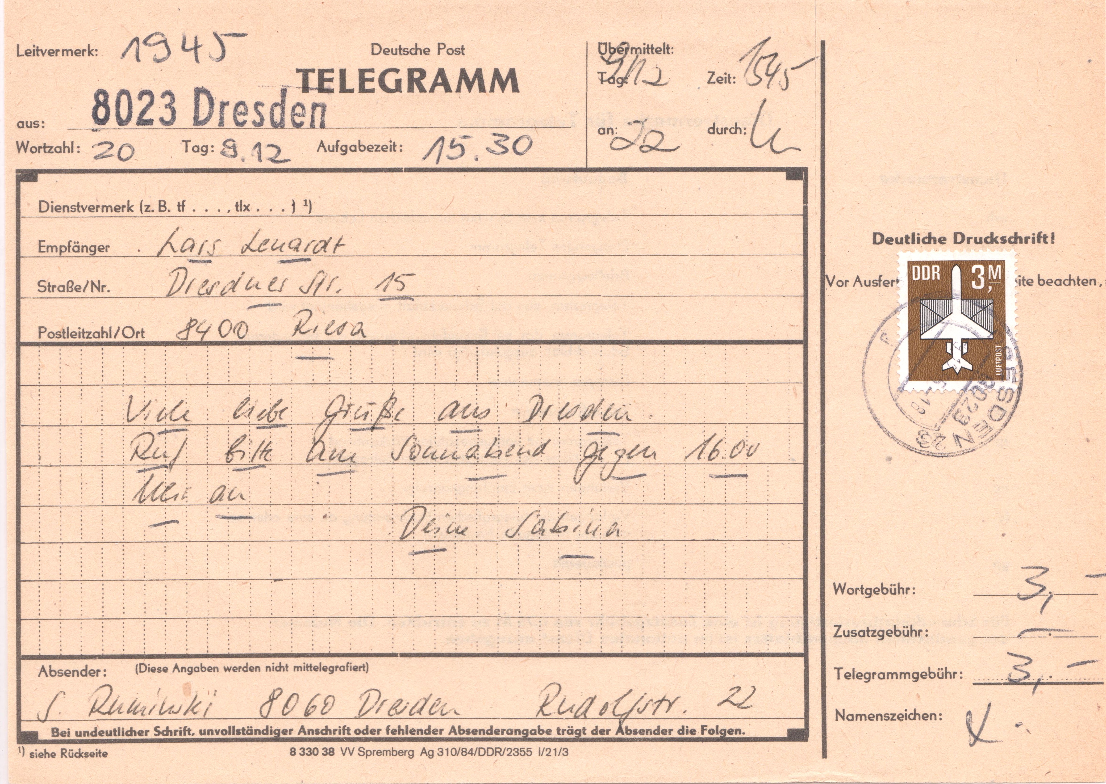 Solch ein Vordruck wurde in der DDR postintern ausgefüllt, wenn ein Telegramm aufgegeben wurde: