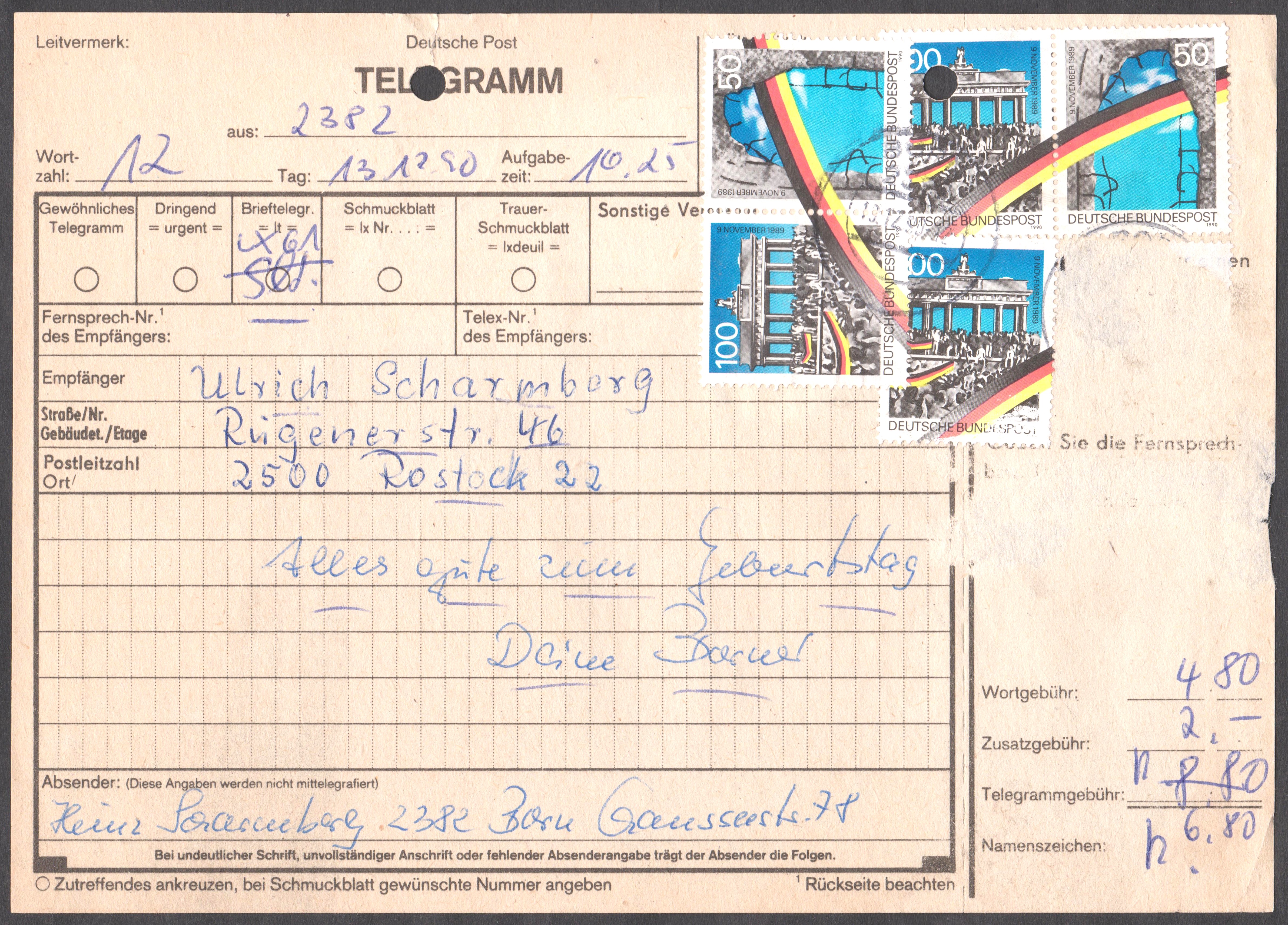 Telegramm aus der DDR, aufgegeben am 26.06.1990 in 2382 BORN: