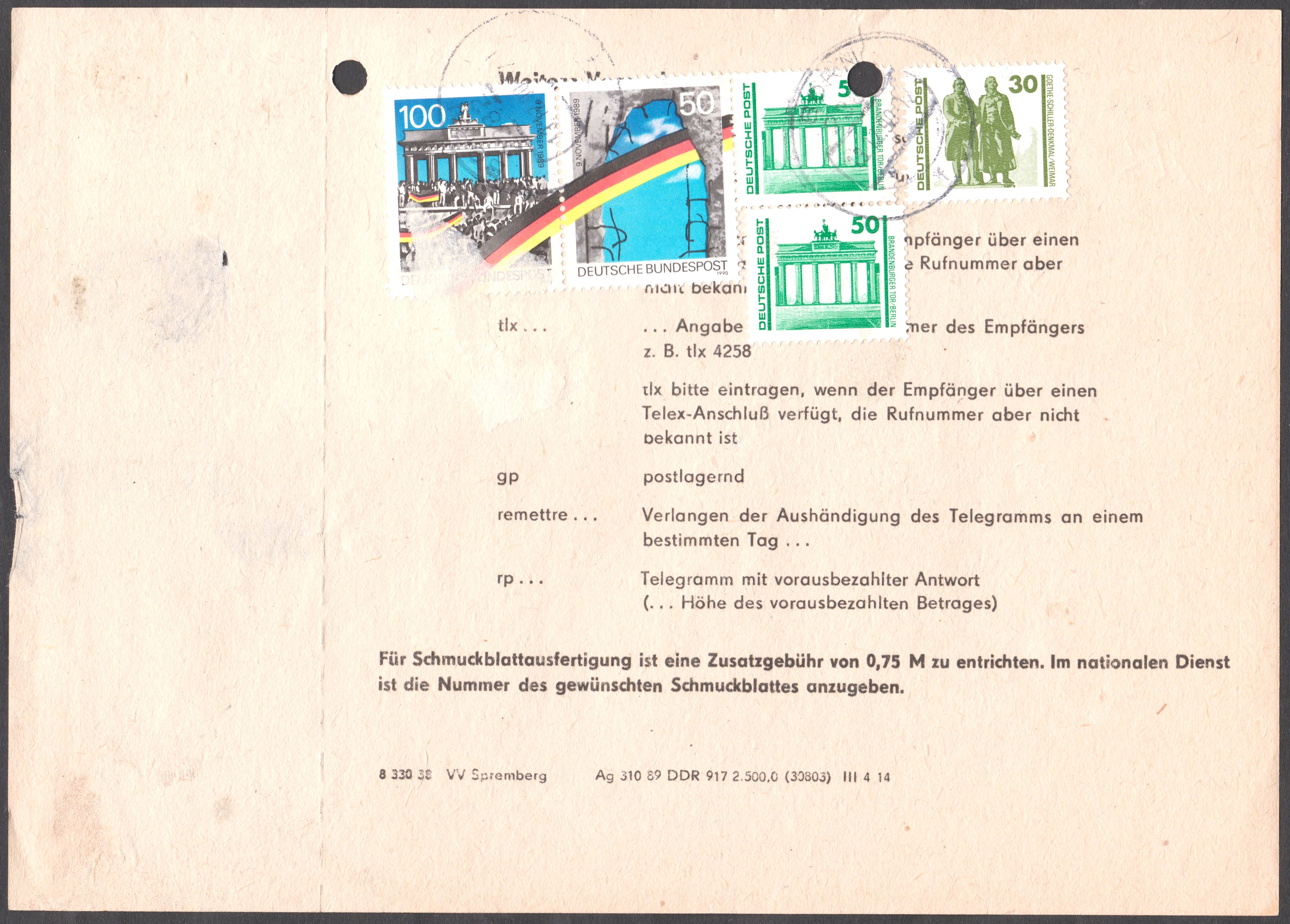 Die bei der Aufgabe dieses Telegramms zu zahlende Gebühr von insgesamt 480 Pfennig wurde in Postwertzeichen auf der Rückseite verklebt, die am 13.07.1987 per Poststempel entwertet wurden.