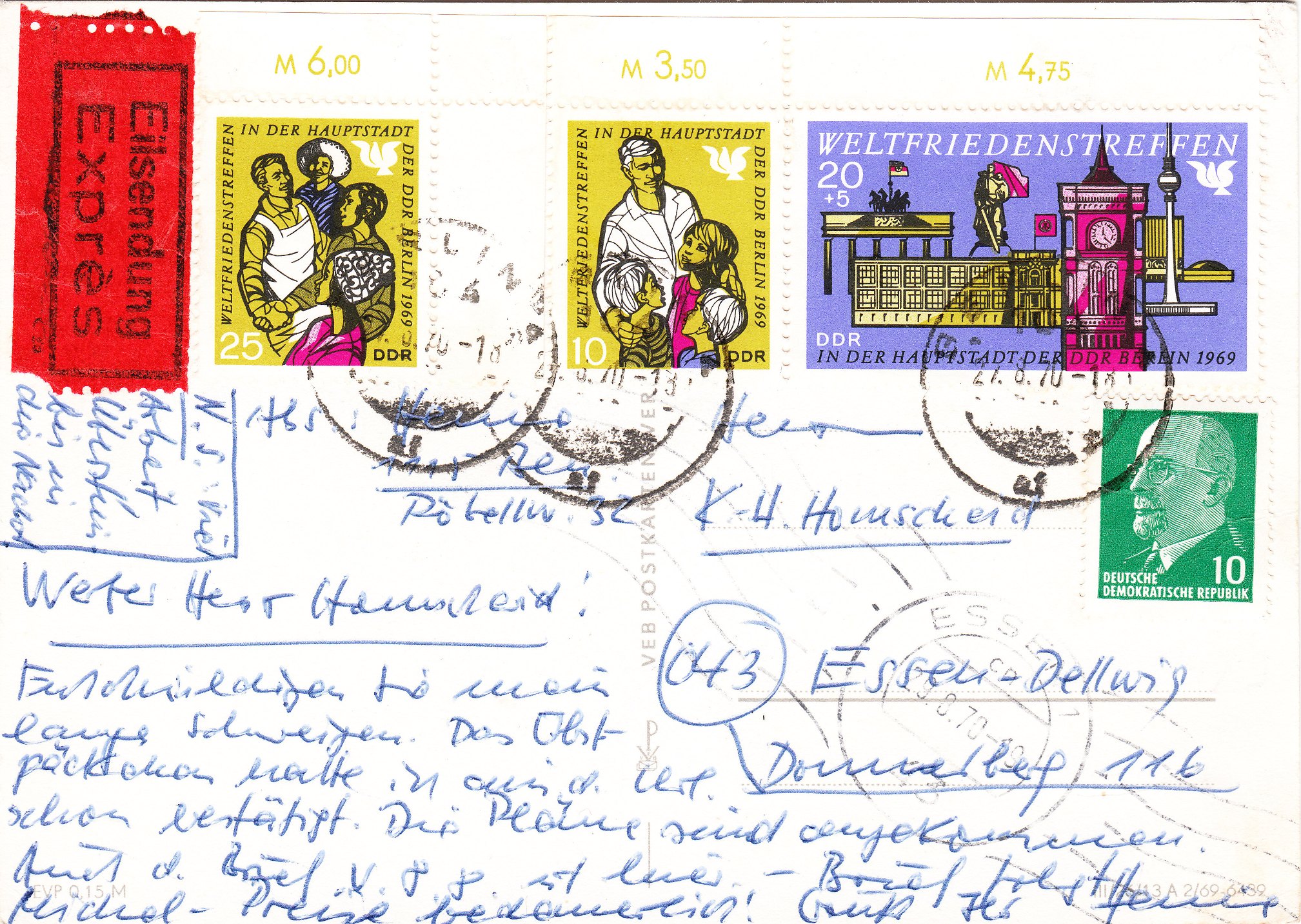 Diese Postkarte in die Bundesrepublik Deutschland = für die DDR ins Ausland (15 Pf) per Eilzustellung (50 Pf) wurde am 27.08.1970 mit einem Zusammendruck W Zd 204, einer MiNr. 1480 als Eckrand 2 sowie einem 10 Pf Wert der Dauerserie Ulbricht portorichtig frankiert: