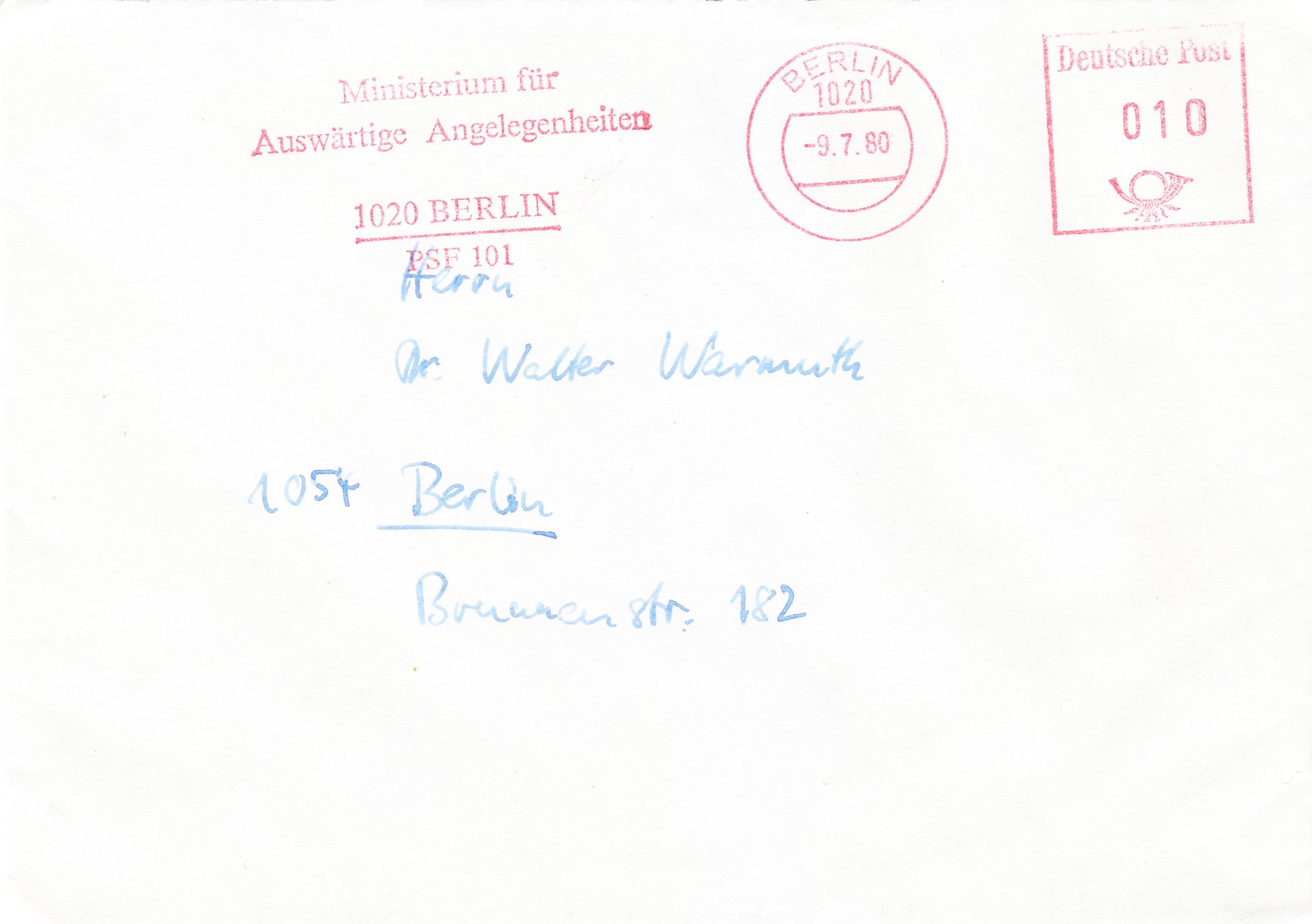 Der heutige Beleg, am 09.07.1980 gelaufen im Ortsverkehr Berlins, trägt die Absenderangabe "PSF 101/1a", das steht für die "Botschaft der DDR in der UdSSR" als Absender: