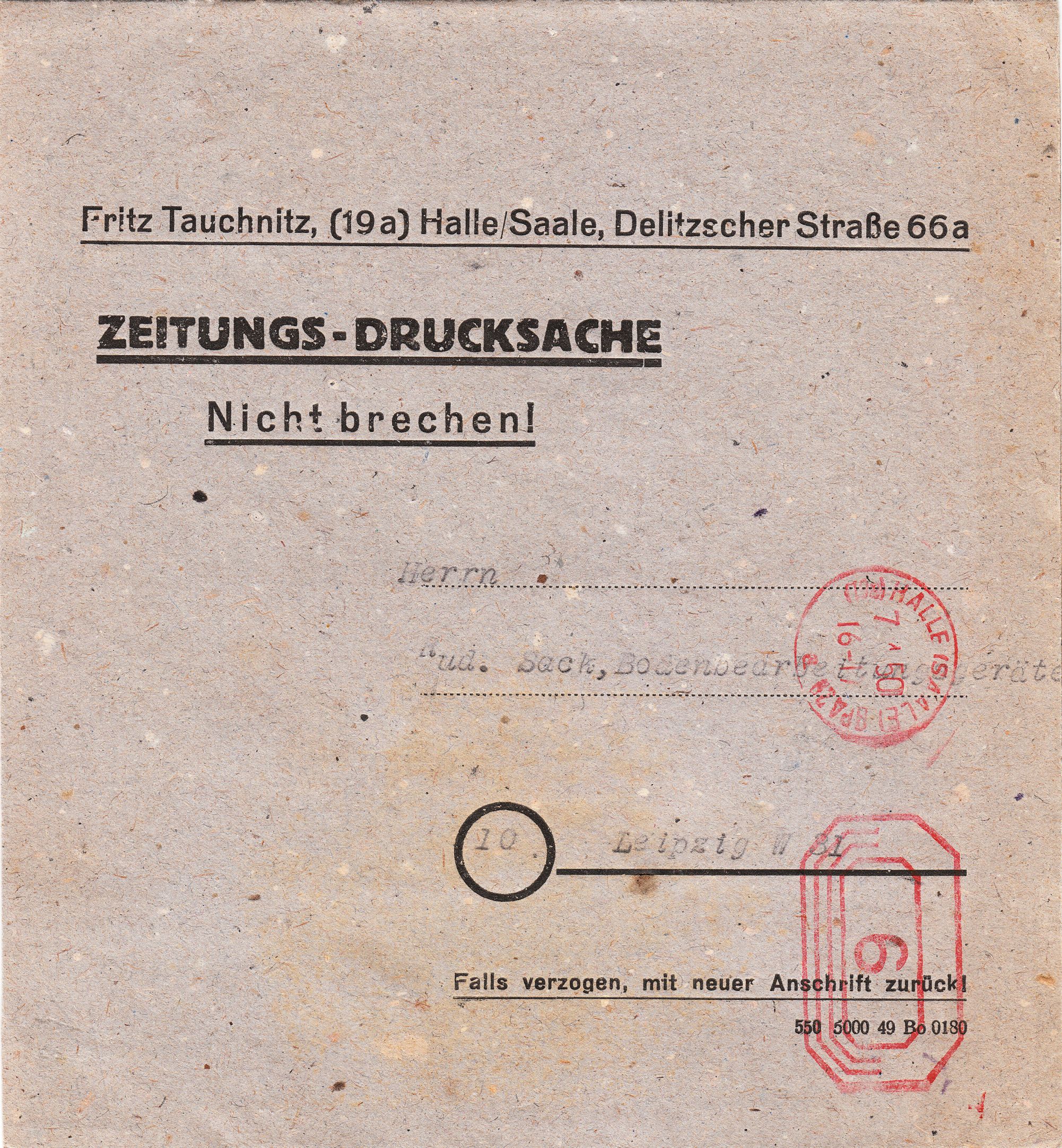Zeitungsdrucksache der Portostufe zu 6 Pfennig, am 07.04.1950 aufgegeben in Halle an der Saale beim "BPA" = Bahnpostamt, wo die Frankatur per Postfreistempel erfolgte: