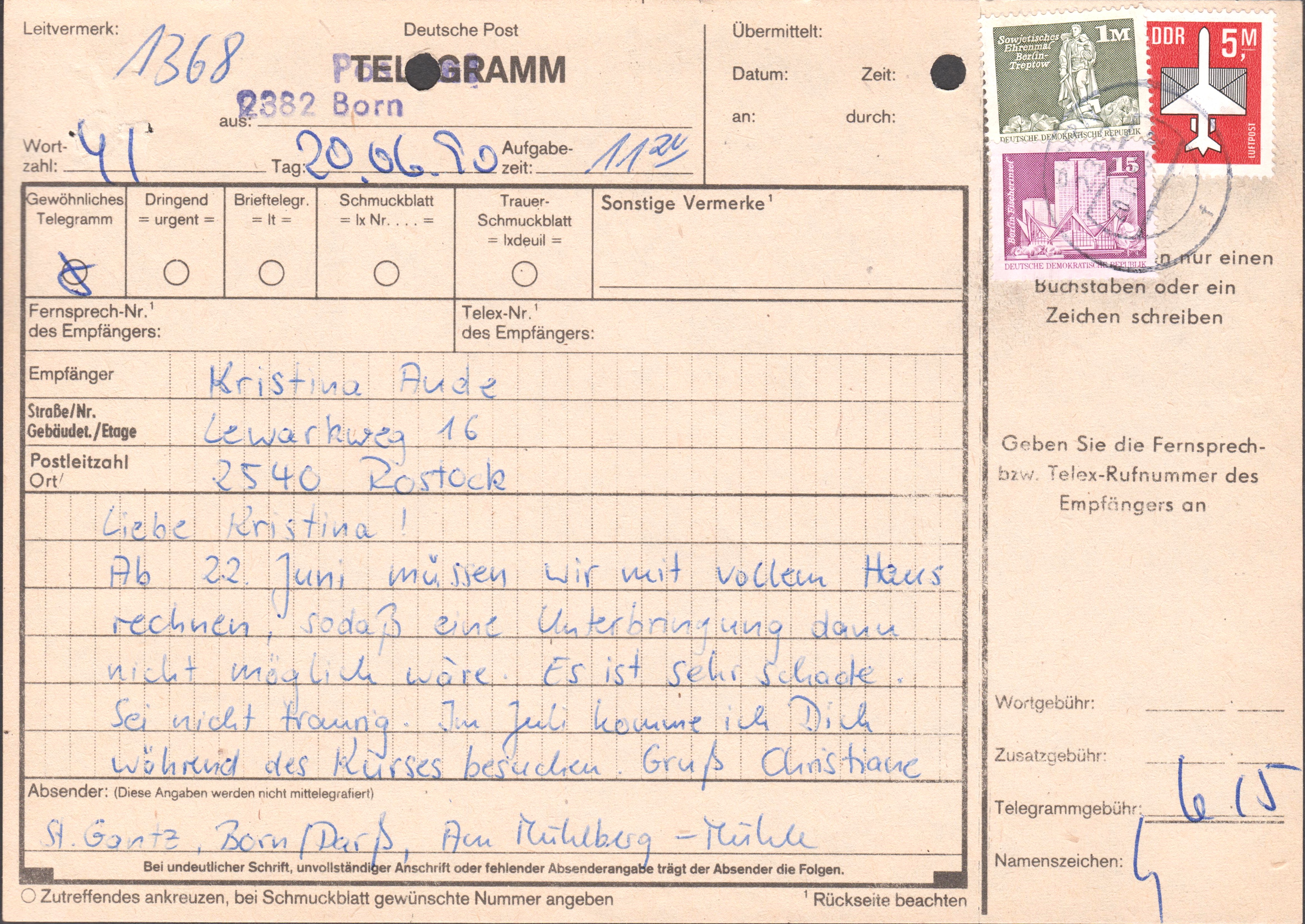 Telegramm aus der DDR, aufgegeben am 20.06.1990 in 2382 BORN: