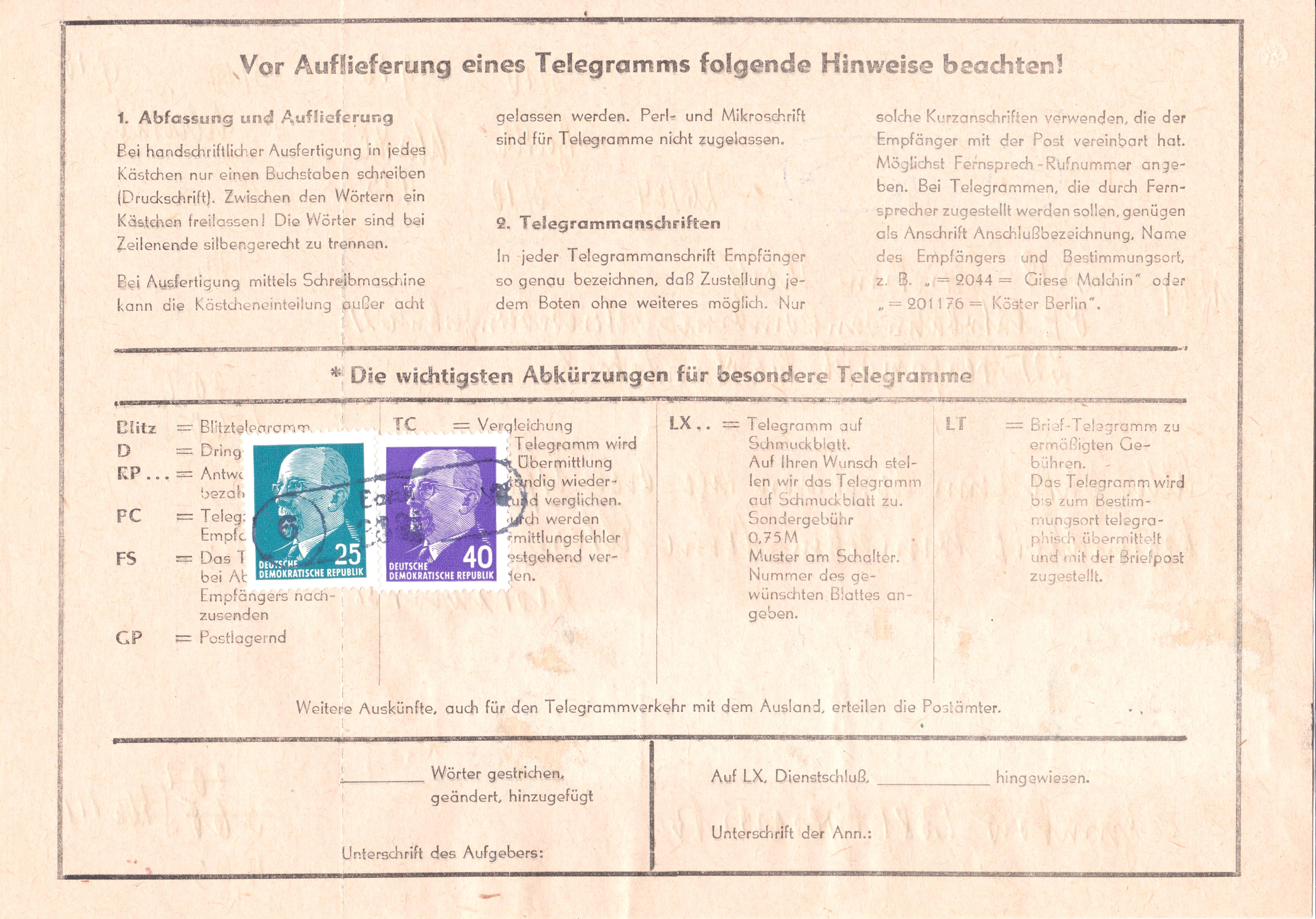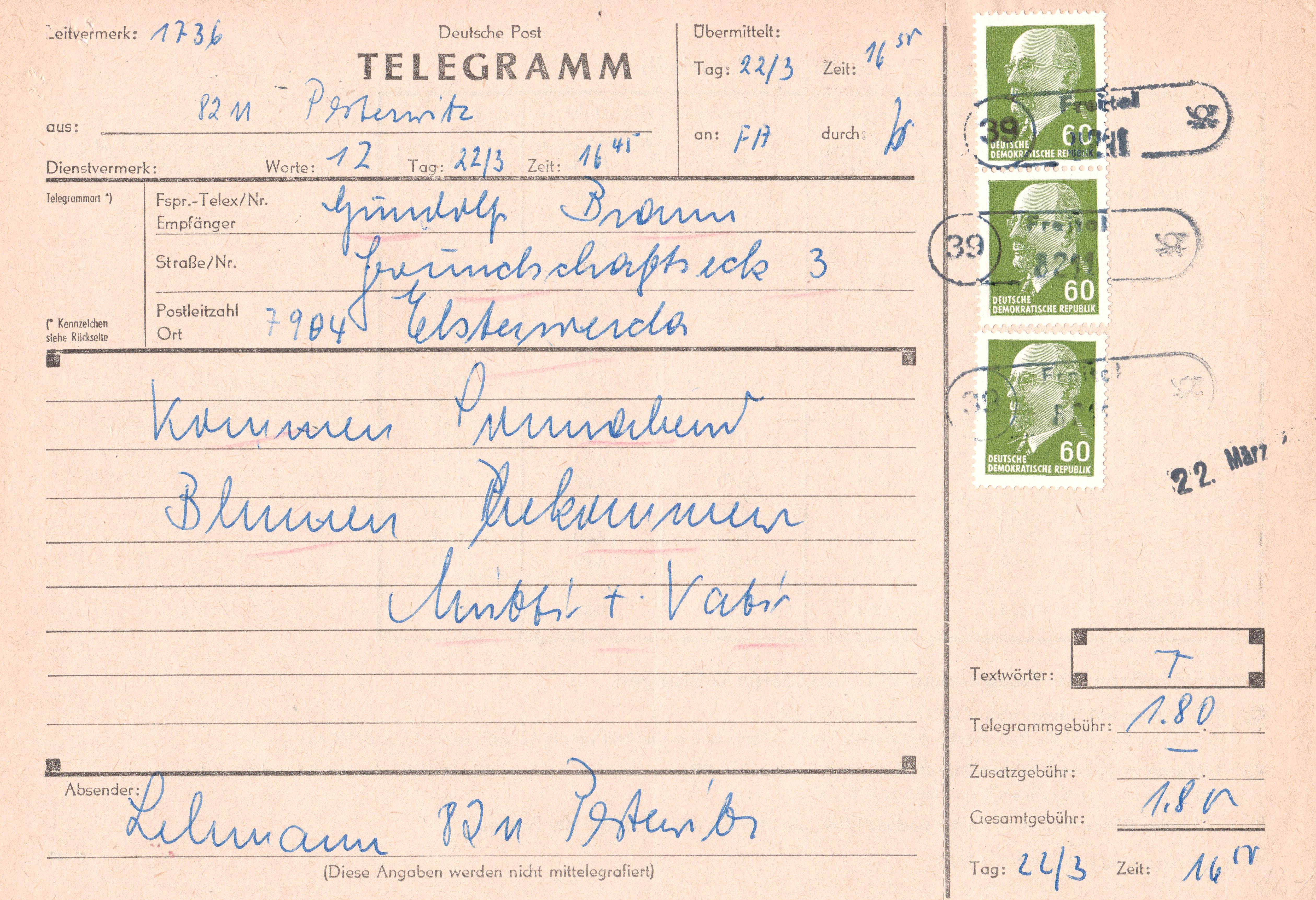 Dieses Telegramm mit 6 Worten kostete laut der rückseitig abgedruckten Liste "Gebühren für Telegramme innerhalb der DDR" 1,80 M, weshalb als Mehrfachfrankatur 3 Postwertzeichen der Wertstufe 60 Pfennig der Dauerserie Walter Ullbricht verklebt wurden.