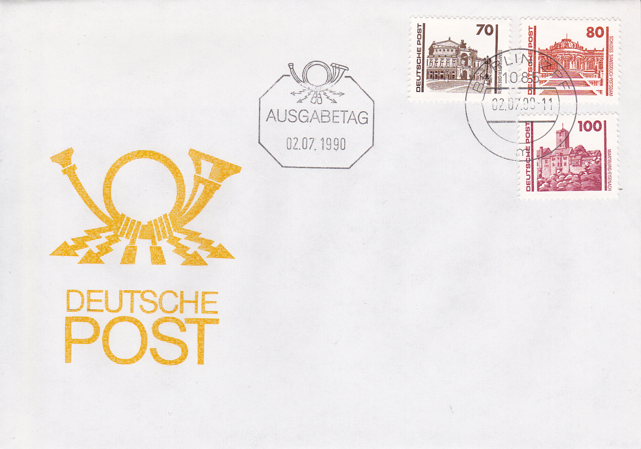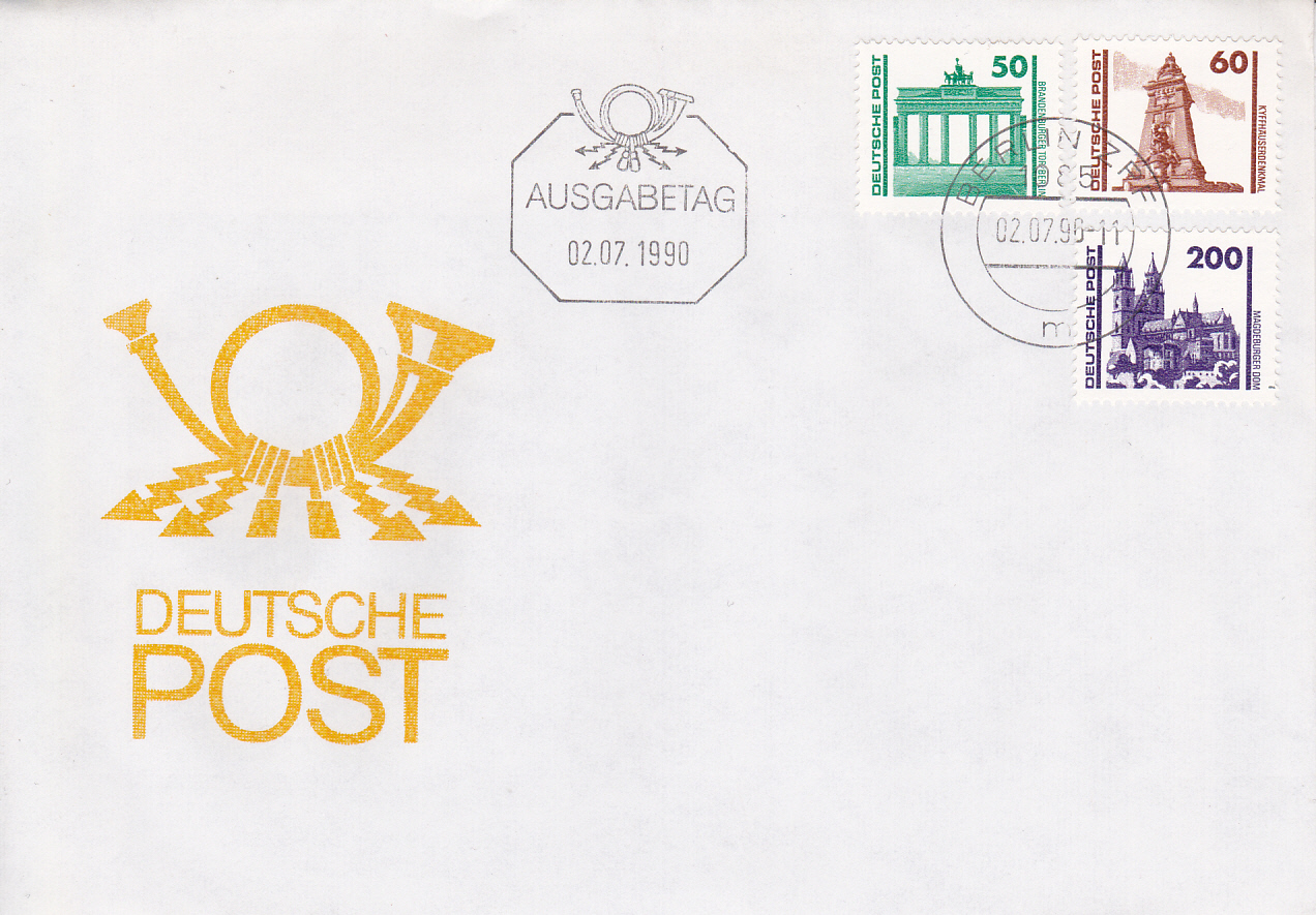 Die Deutsche Post hat mit dieser Serie FDC angeboten und verkauft. Die Marken wurden dabei auf drei Umschläge verteilt mit einem Tagesstempel 1085 Berlin ZPF am 02.07.1990 gestempelt und ein Zusatzstempel "Ausgabetag" angebracht.